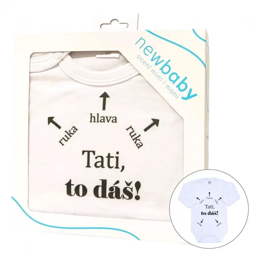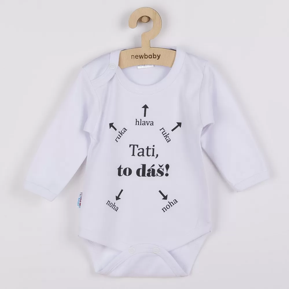 Originální bavlněné kojenecké body s dlouhým rukávem New Baby, s vtipným nápisem Tati, to dáš! Barvy použité k potisku jsou certifikované a vhodné pro miminka. Je vyrobeno z příjemného a kvalitního materiálu, ve kterém se bude Vaše miminko cítit příjemně. Body má zapínáni na cvočky na ramínku a mezi nožičkami, což usnadňuje oblékání a přebalování. Dopřejte Vašemu miminku vyniknout v originálním body. Složení: 100% bavlna. Rozměry: obvod kolem hrudníku cca 46 cm, délka rukávu cca 24 cm, celková délka cca 40 cm.