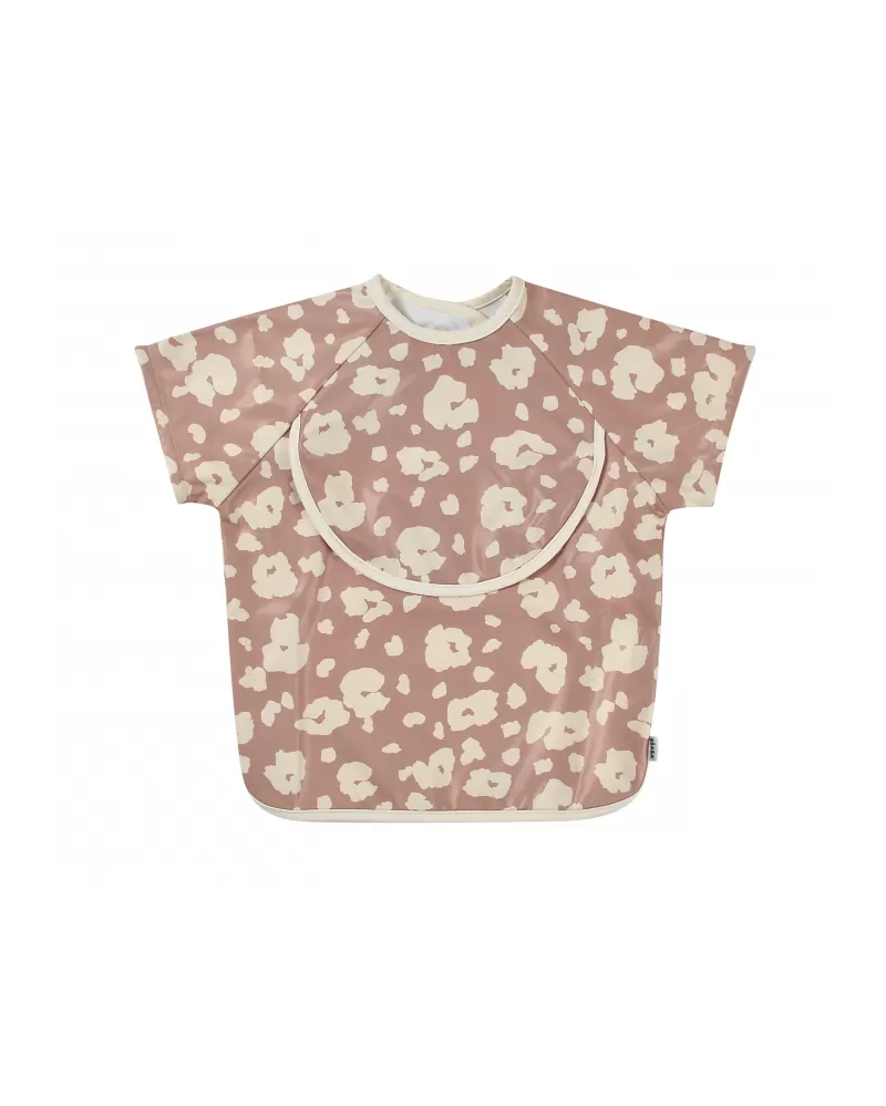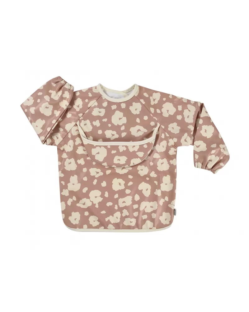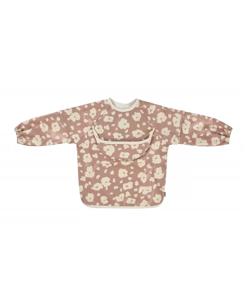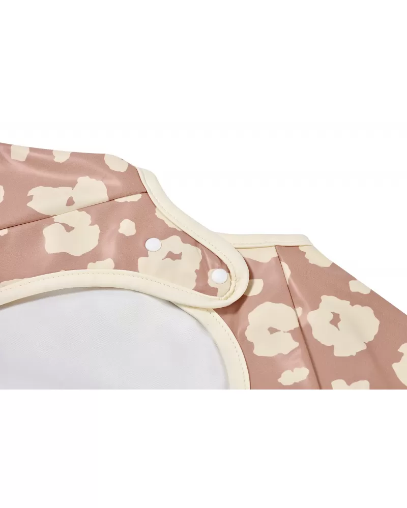Nastavitelné zapínání na druky za krkem umožňuje snadné oblékání i přizpůsobení bryndáku velikosti dítěte. Elastické zakončení rukávů poskytuje pohodlí při nošení.