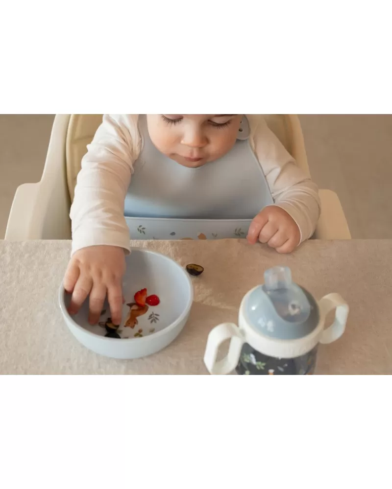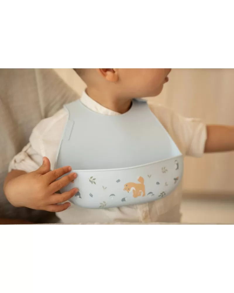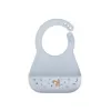 Bryndák z jemného, pružného silikonu s krásným potiskem je vybaven širokou kapsou pro zachycení drobečků i kapek. Dokonale ochrání oblečení dítěte již od prvních pokusů o samostatné stolování. Zapínání za krkem umožňuje snadno upravit velikost kolem krku.