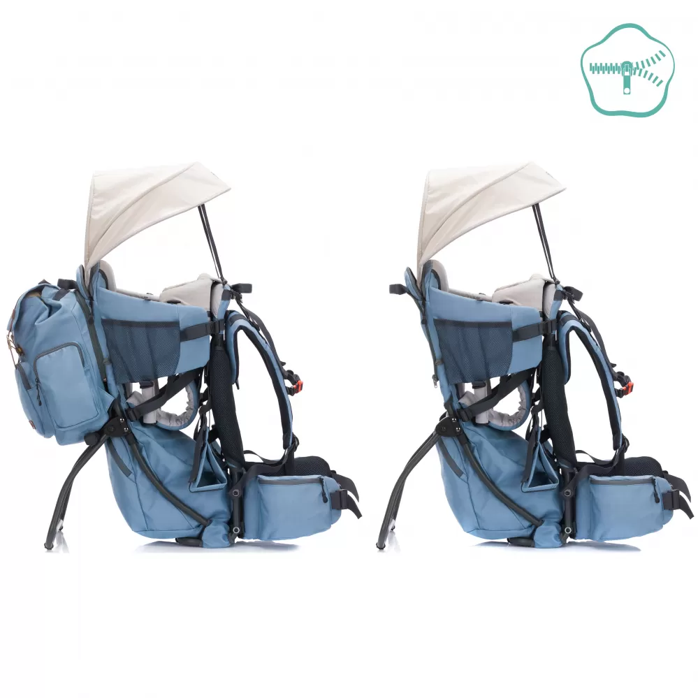 Velkou výhodou je také odnímatelný batoh, který poskytuje dostatek úložného prostoru a lze ho jednoduše odepnout pomocí zipu. Díky této flexibilitě můžete krosnu využít nejen při výletech, ale také jako stylový přebalovací batoh pro každodenní použití. Nechybí ani praktická sluneční stříška, která chrání dítě před ostrým sluncem nebo větrem.