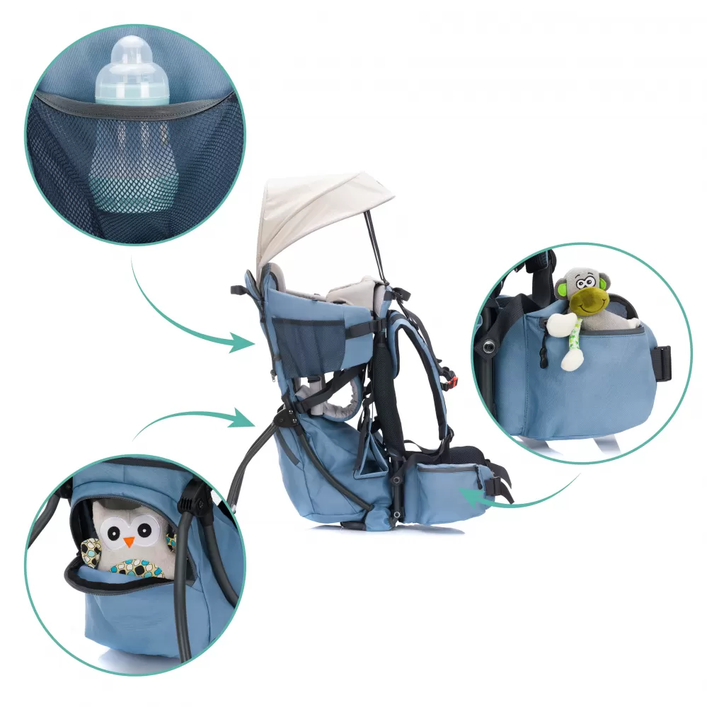 Krosna je navržena tak, aby bylo dítěti co nejpohodlněji – celá sedací část je měkce a kvalitně polstrovaná. Bezpečnost dítěte zajišťuje spolehlivý 5bodový bezpečnostní pás, který drží dítě pevně, ale pohodlně na svém místě. S nosností až 20 kg je nosítko vhodné i pro větší děti a díky více praktickým kapsám máte vše potřebné na dosah – láhev, svačinu, plínky i hračky.