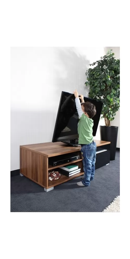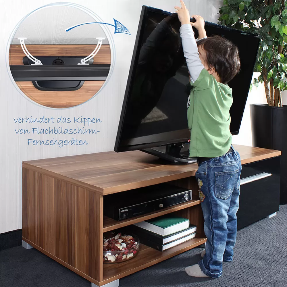 Nové držáky slouží pro zabránění překlopení TV zvědavým dítětem. Jsou vhodné pro téměř všechny moderní televizory s plochou obrazovkou a otvory se závity. Vzdálenost od stěny lze nastavit od 5 do 18 cm a díky dodatečnému prodloužení lze celkovou vzdálenost nejen zvýšit, ale také přizpůsobit natočení TV.