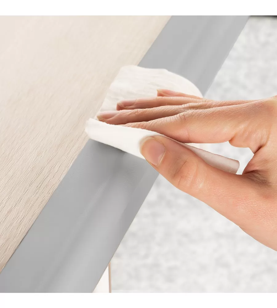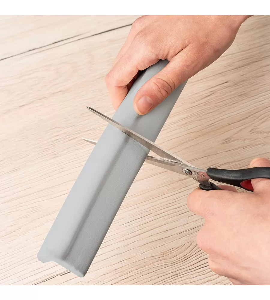 Ochranu hran instalujete v několika krocích. Aby byla zajištěna přesně padnoucí ochrana, lze ochranu hran i lepicí pásku před montáží zkrátit na přesnou délku (obsah: 2x 1m). Pak už jen očistěte hranu, připevněte lepicí pásku na kus nábytku, nasaďte ochranu hran a minutu pevně přitlačte – hotovo. Pokud již není ochrana hran potřeba, lze ji znovu sejmout, aniž by na kusu nábytku zůstaly zbytky.
