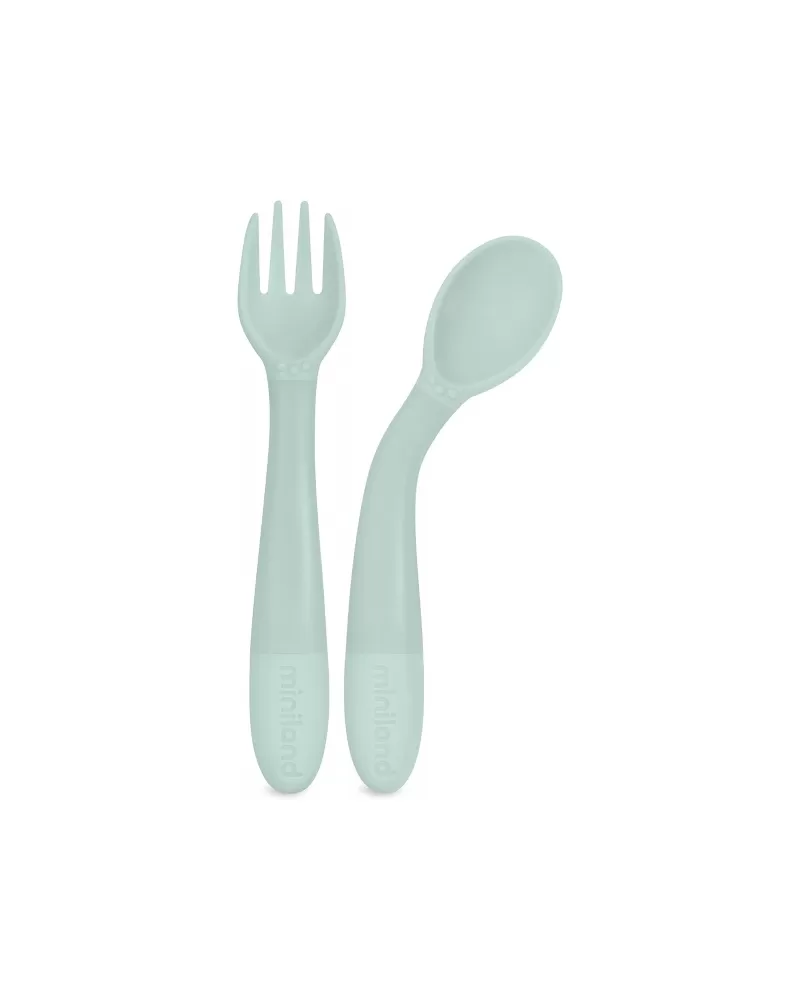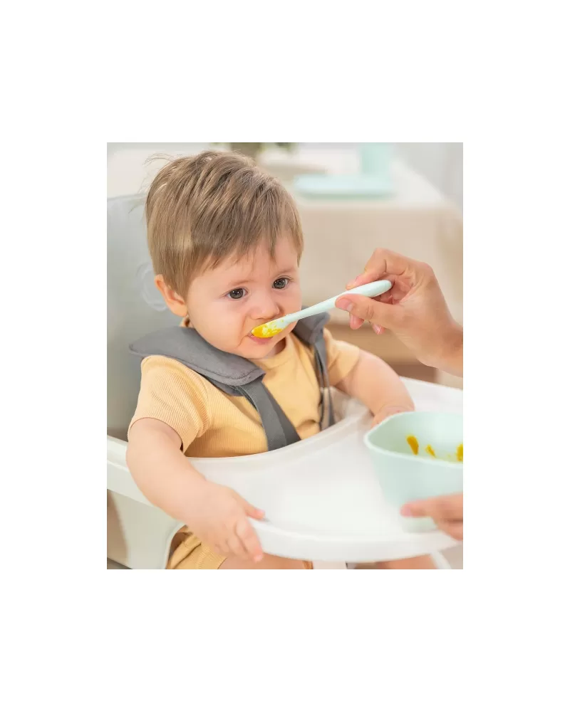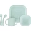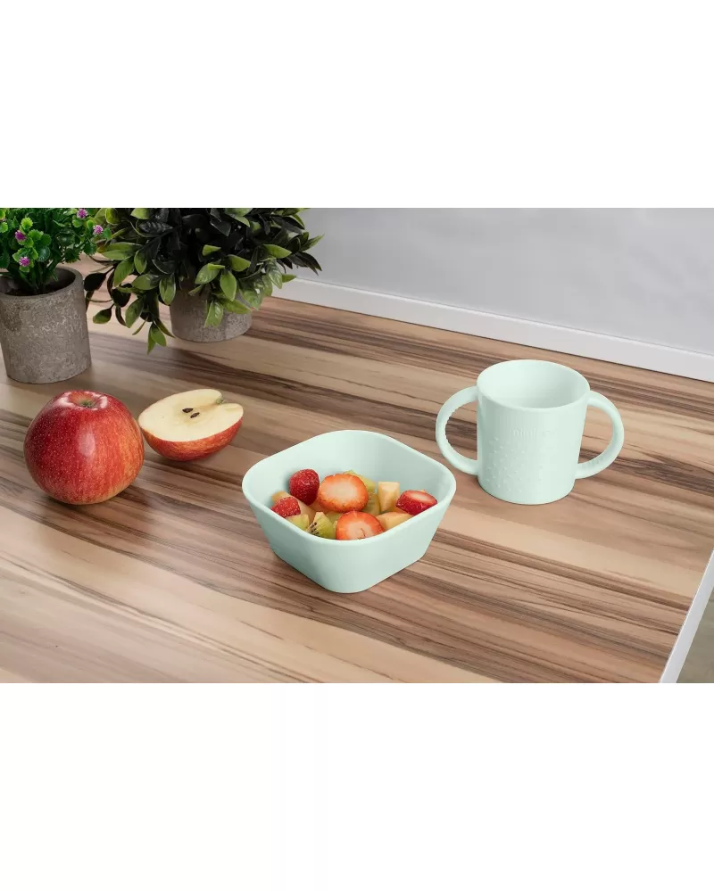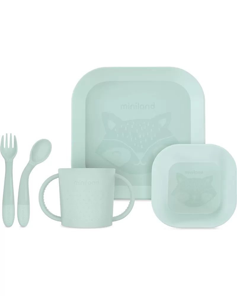 Jídelní sadu tvoří talíř, miska, hrnek se 2 uchy, pružná lžička a vidlička. Talíř i miska s vysokými okraji pomáhají snadnému nabírání pokrmu. Lžička a vidlička jsou vyrobeny z flexibilního příjemného materiálu a mají neklouzavá, kulatá držadla, která usnadňují dítěti držení. Hrnek se dvěma uchy pomáhá dítěti naučit se pít z klasického hrnku.