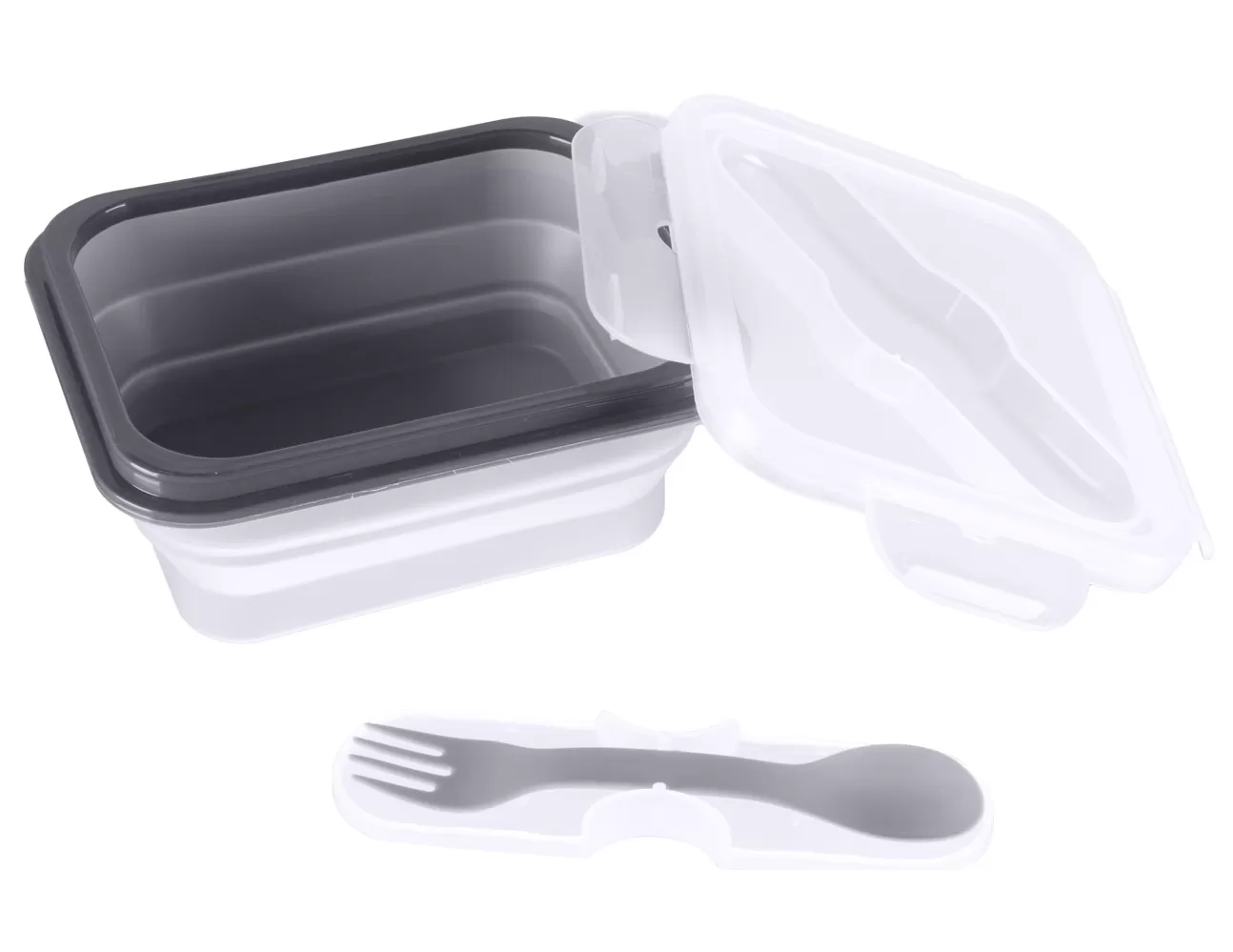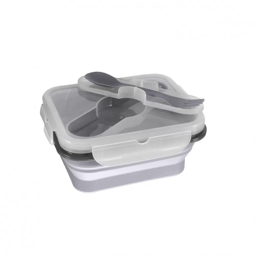 Tento svačinový box je vyroben z bezpečného potravinářského silikonu, který je netoxický a odolný proti rozbití. Jeho velkou výhodou je snadné složení, díky kterému zmenší svůj rozměr až o 60 % a tak je z něj ideální společník na výlety. Víčko velmi dobře těsní, má v sobě zabudovanou přihrádku na příbor, lžička s vidličkou jsou součástí v praktickém pouzdře.