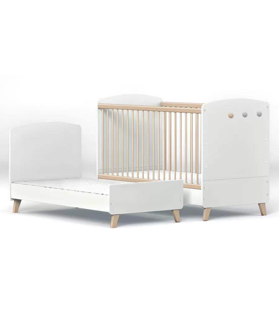 Moderní variabilní dětská postýlka s čely vyrobenými z laminované dřevotřísky a s nožičkami, bočnicemi a s roštem z masivu.