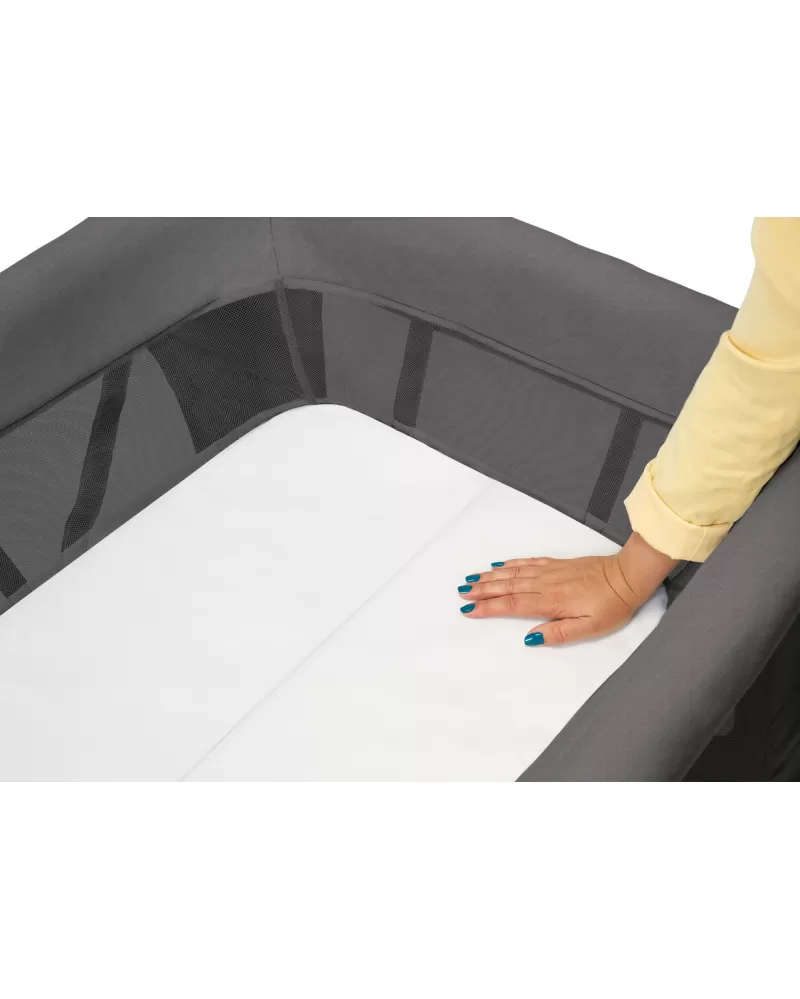 Postýlka je vybavena skládací dvoudílnou pěnovou matrací. Pro miminko od narození je určena poloviční velikost matrace pro vytvoření útulného prostředí s vyvýšeným dnem. Pro dítě od cca 6 měsíců spojíte oba díly matrace zipem a umístíte ji na dno postýlky. Pro obě velikosti matrace je možné dokoupit samostatně prodávaná natahovací prostěradla.