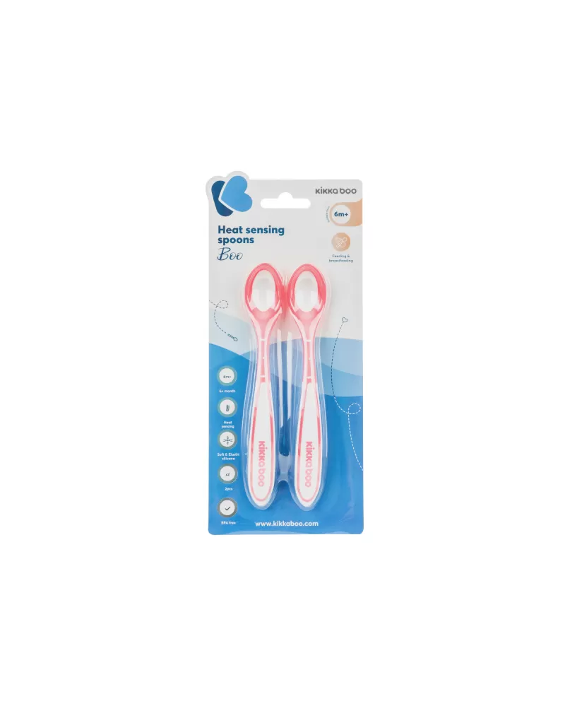Lžičky KikkaBoo s tepelným senzorem změní barvu, pokud je teplota příkrmu příliš vysoká. Ideální pro pokrmy ohřívané v mikrovlnné troubě, u kterých hrozí riziko nestejnoměrného ohřátí. Měkké zakončení je šetrné k citlivým dásním dítěte, dlouhá rukojeť usnadňuje snadné nabírání ze skleničky.