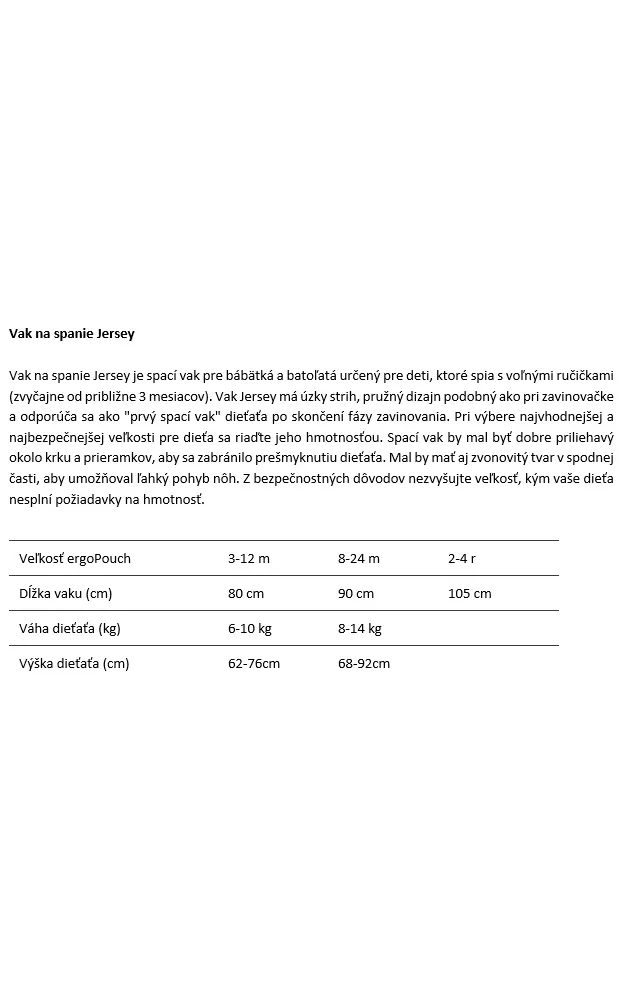 Co je TOG? TOG je zkratka pro Thermal Overall Grade a je to jednotka měření izolace a hřejivosti spacích oděvů a ložního prádla. Čím nižší je hodnocení TOG, tím je látka lehčí; čím je hodnocení vyšší, tím je látka více vycpaná a izolována. Vak na spaní s rukávy je celoroční spací pytel pro miminka a batolata, která spí s rozpaženýma rukama obvykle od přibližně 3 měsíců. Vak na spaní Jersey má úzký střih, pružný design podobný jako u zavinovačky a doporučuje se jako „první spací pytel“ dítěte po skončení fáze zavinování. Design schválený pro bezpečný spánek je vyroben z měkké, elastické organické bavlny s certifikátem GOTS, která je netoxická a šetrná k pokožce dítěte. Ergonomicky navržený vak má zvonovou spodní část, která podporuje zdravý vývoj kyčlí a je schválena Mezinárodním institutem pro dysplazi kyčlí a materiál je elastický, aby se dítě mohlo během spánku volněji pohybovat a zůstat v pohodlí. Vak na spaní Jersey 3,5 TOG je ideální pro udržení tepla pro dítě během noci v místnostech o teplotě 14-20 °C. Hodnota 3,5 TOG znamená, že při používání tohoto výrobku nejsou zapotřebí další přikrývky v postýlce, což z něj činí možnost bezpečného spánku. Rodiče si mohou být jisti, že prodyšná organická a přírodní vlákna pomáhají regulovat teplotu dítěte a zabraňují přehřátí. Rodiče se mohou řídit pokojovým teploměrem ZDARMA a příručkou What to Wear (Co si obléct), které jsou součástí výrobku, a vhodně pod ně navrstvovat vrstvy, aby jejich dítě zůstalo v teple. Spací pytel Jersey splňuje všechny bezpečnostní normy v Austrálii a na Novém Zélandu a je přezkoumán Asociací pro ekzémy v Austrálii jako výrobek šetrný k pokožce. Všechny tkaniny ergoPouch jsou barveny netoxickými barvami na bázi vody a dodávají se v trendových potiskech a barvách, které se hodí do každého dětského pokoje. Všechny potisky jsou navrženy přímo v ergoPouch. Vlastnosti: - organická bavlna s certifikátem GOTS - prodyšná přírodní vlákna - úzký střih a pružnost - zvonovitá spodní část - hodnocení TOG pro teplo - zapínání na zip - dvoucestný zip - certifikovaná netoxickost - šetrné k pokožce - nejsou zapotřebí žádné přikrývky - lze prát v pračce Jak používat: Položte vak na rovný, nízký povrch s otevřeným zipem. Položte dítě na vršek vaku na spaní. Ruce vložte do rukávů a nohy zastrčte do kapsy a zapněte zip. Chcete-li dítěti vyměnit plenu nebo jej ochladit, otevřete zip zespoda kapsy, abyste uvolnili nohy a spodní část trupu. Po skončení práce zip opět zavřete. Podle potřeby pod ni navrstvěte teplou vrstvu. Pro názorný návod, jak se to všechno spojuje, si prohlédněte naše video Jak používat spací pytel. Vždy uspávejte dítě v bezpečném prostředí na spaní.