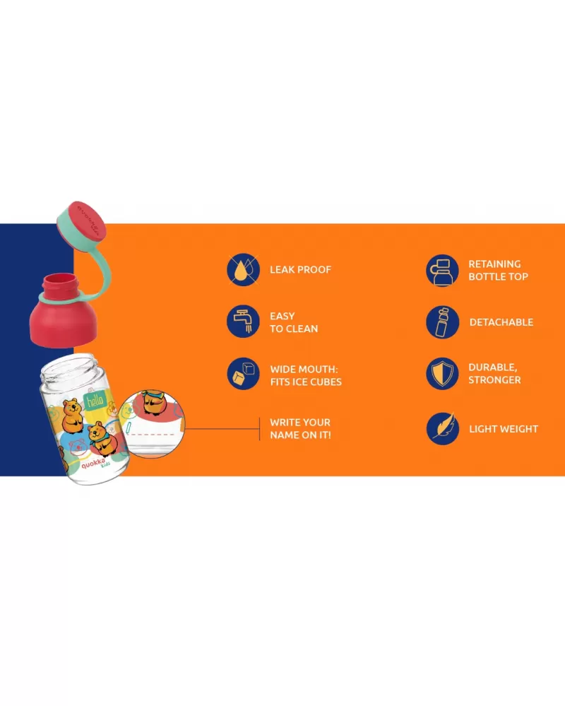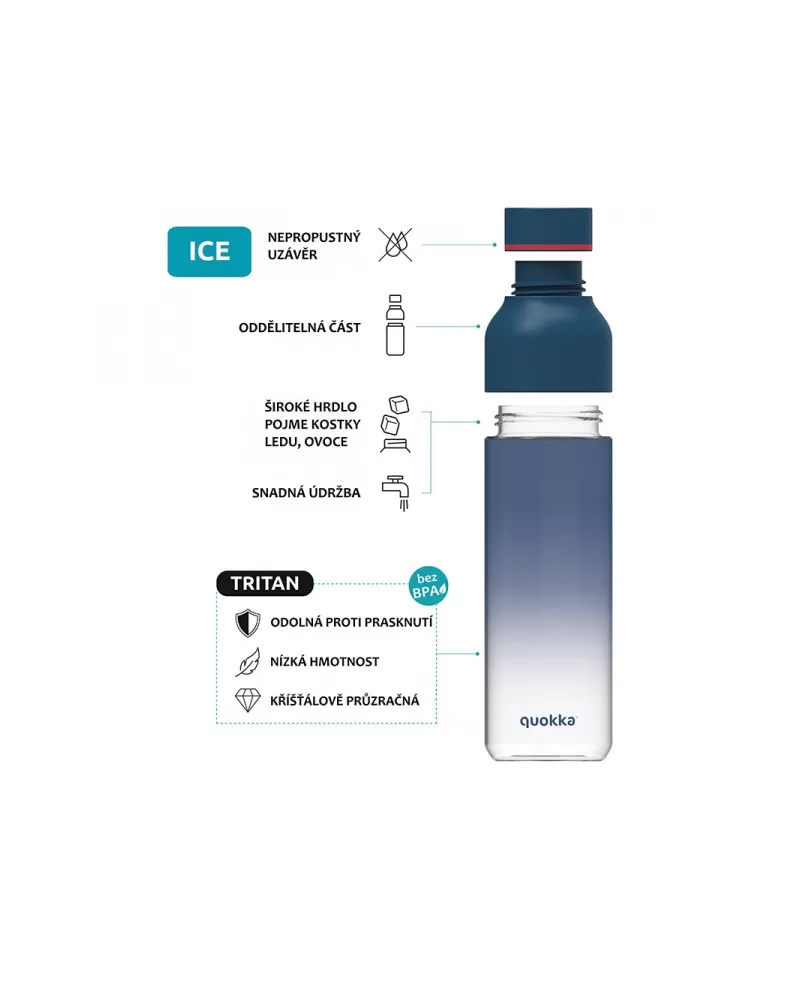 Dětská láhev Quokka Ice Kids s dvojitým otevíráním umožňuje vložení kostek ledu či kousků ovoce a zároveň se snadno čistí. 100% těsnicí, šroubovací uzávěry chrání obsah láhve před vylitím. Poutko usnadňuje přenášení a zároveň chrání uzávěr před ztracením.