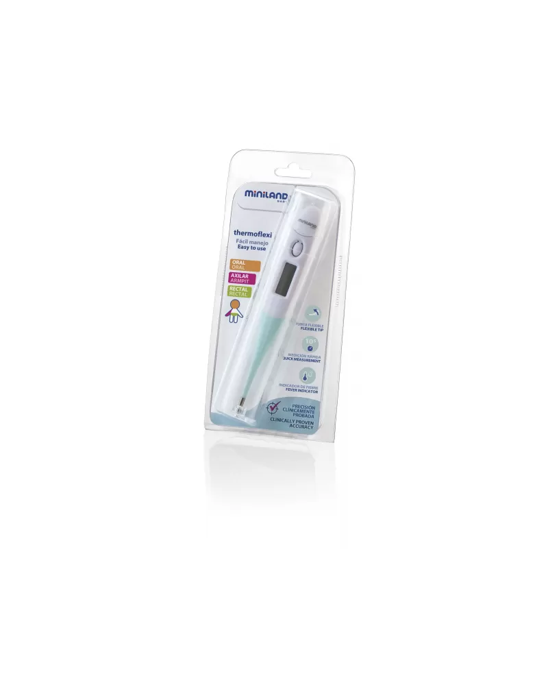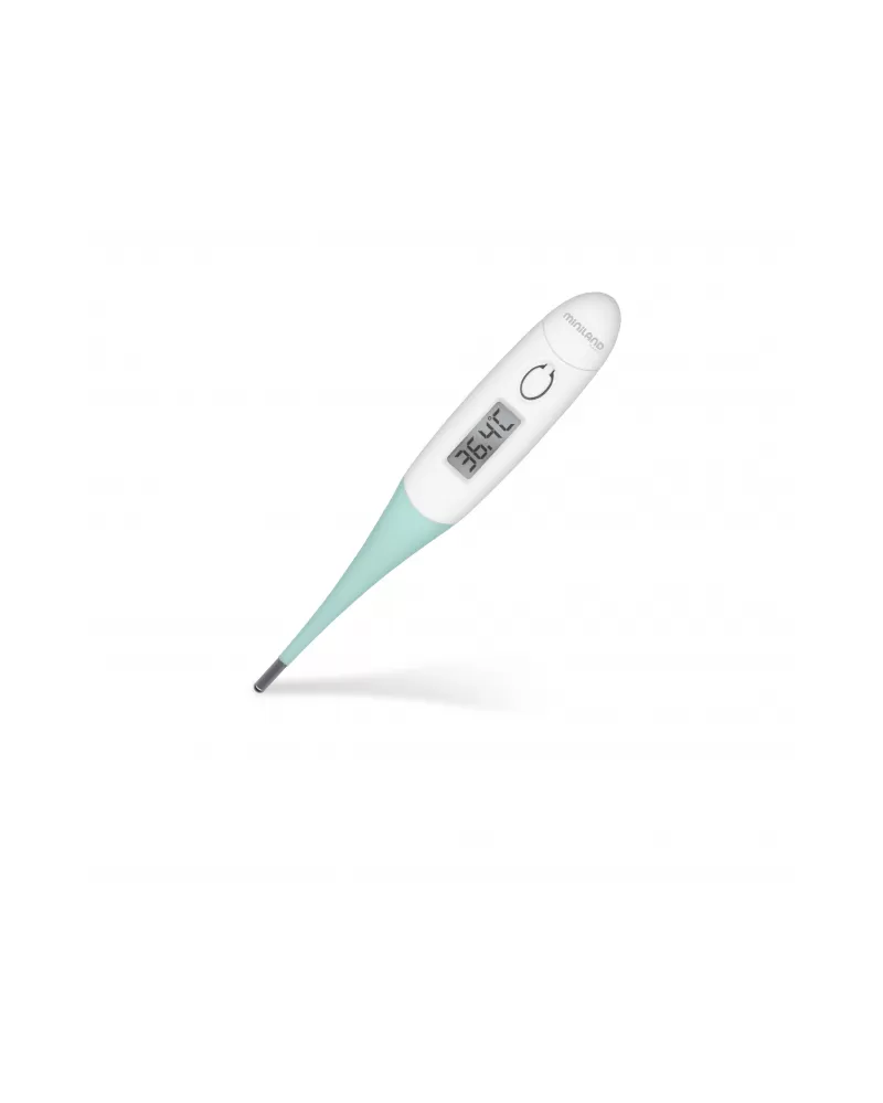 Digitální teploměr Miniland s ohebnou špičkou umožňuje rychlé a pohodlné měření teploty v podpaží, ústech i rektálně.