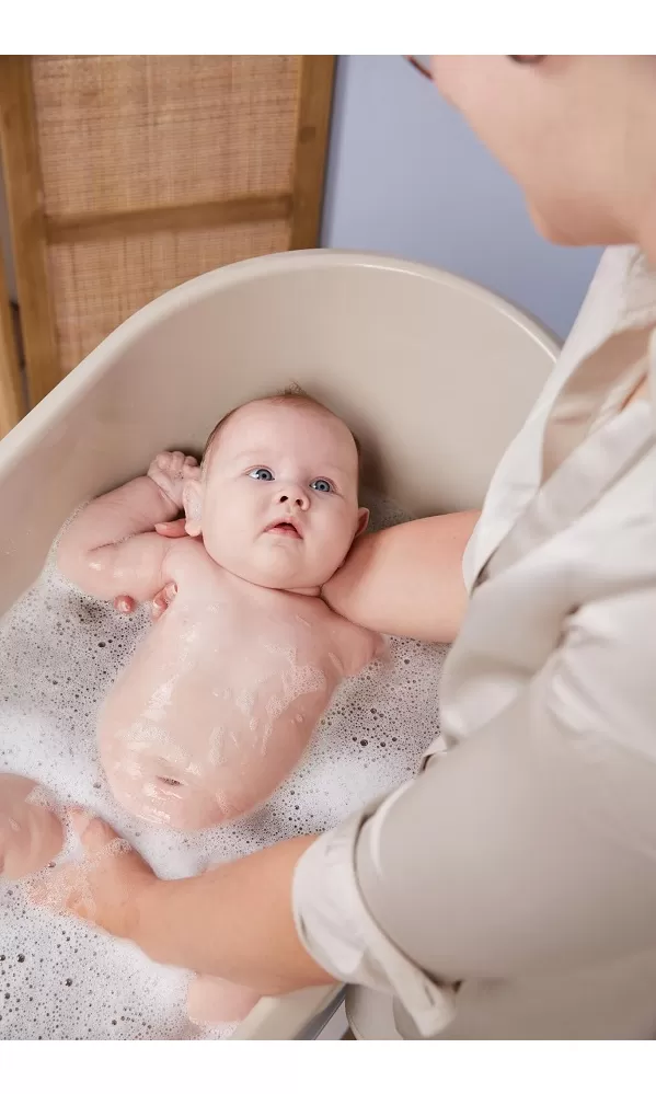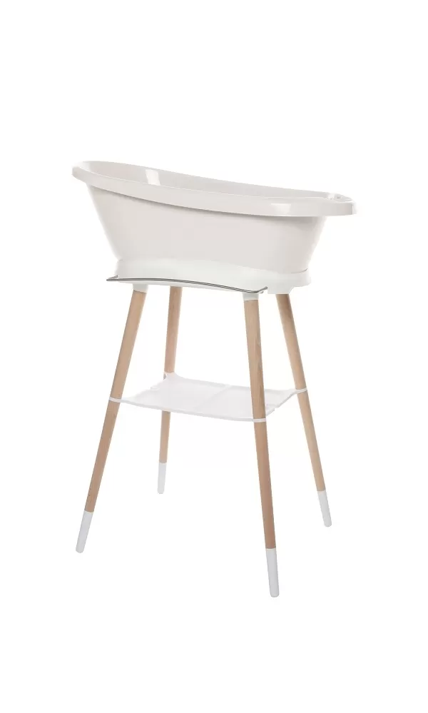 Velmi stabilní vanový stojan Sense má nohy vyrobené z lakovaného bukového dřeva s certifikací FSC. To dodává stojanu teplý moderní vzhled. Je vybaven praktickými pomůckami; vpředu je připevněn držák na ručníky. Prostorná plastová polička poskytuje dostatek místa například pro šampon, žínku, vodní hračky nebo koupací gel. To znamená, že máte po ruce všechny potřebné věci, abyste si s malým mohli v klidu koupání užít. Inovativní systém upevnění zajišťuje, že vanu lze snadno připevnit ke stojanu a stejně snadno sejmout. Po kliknutí můžete své miminko nerušeně a bezpečně koupat.