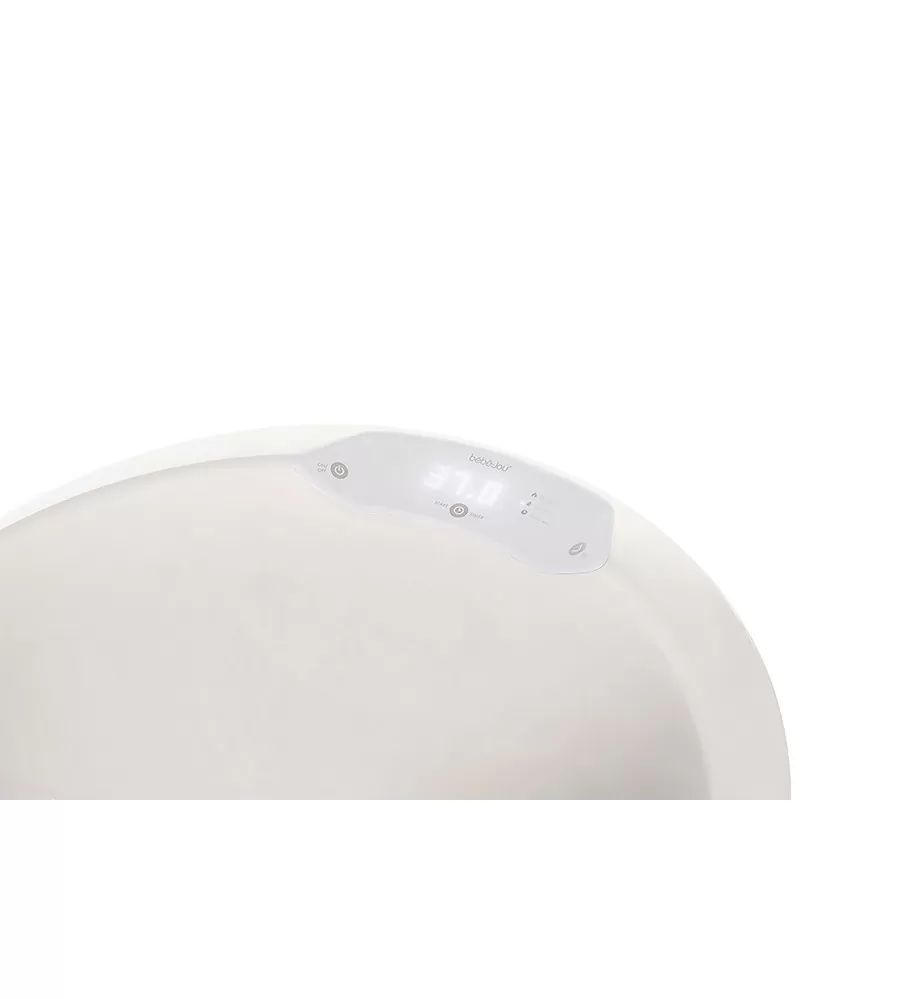 Sada komfortní digitální dětské vaničky Bébé-jou Sense Edition ve světle krémové barvě a luxusního stojanu na vaničku Sense.