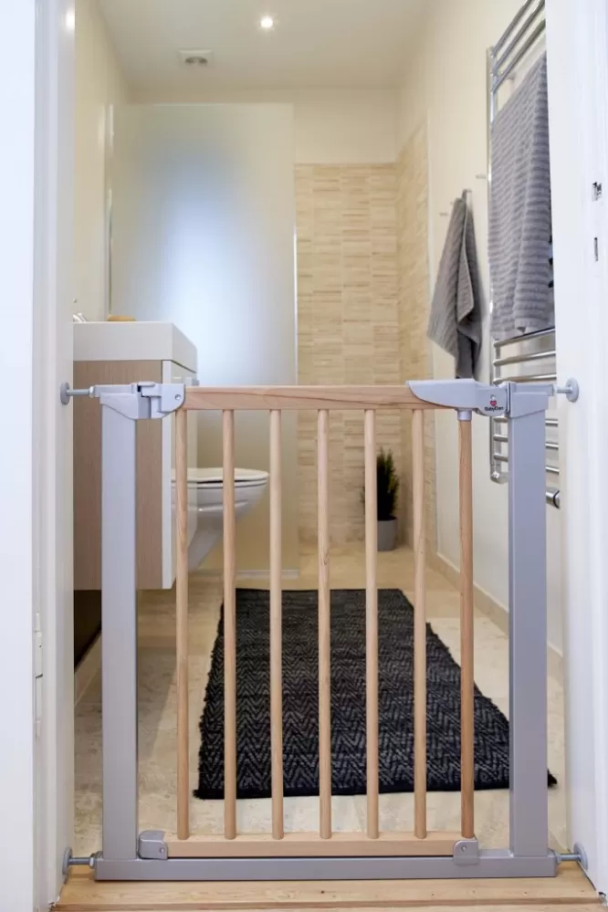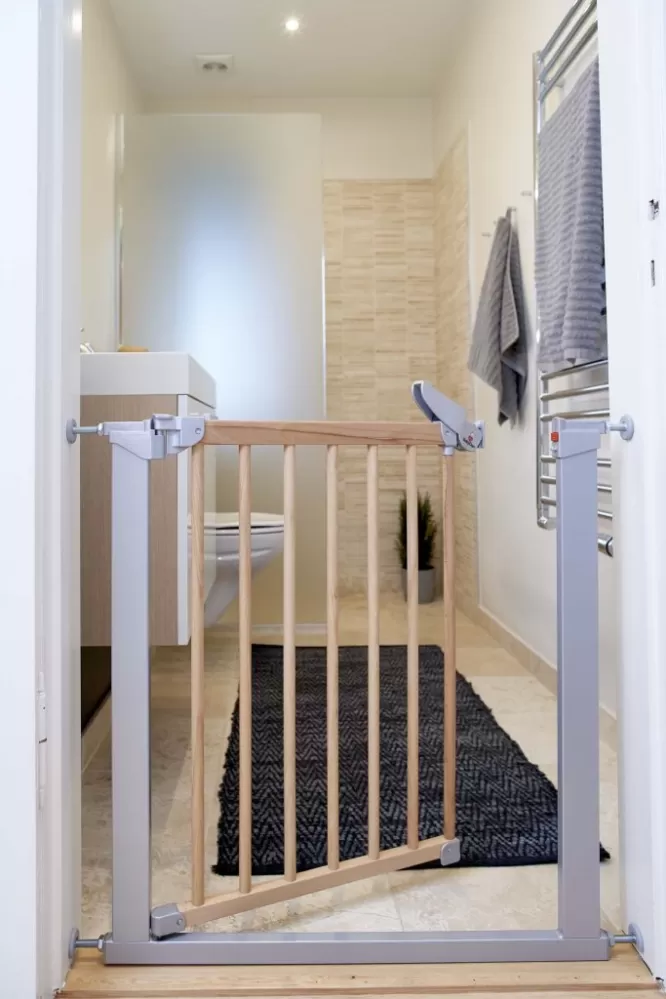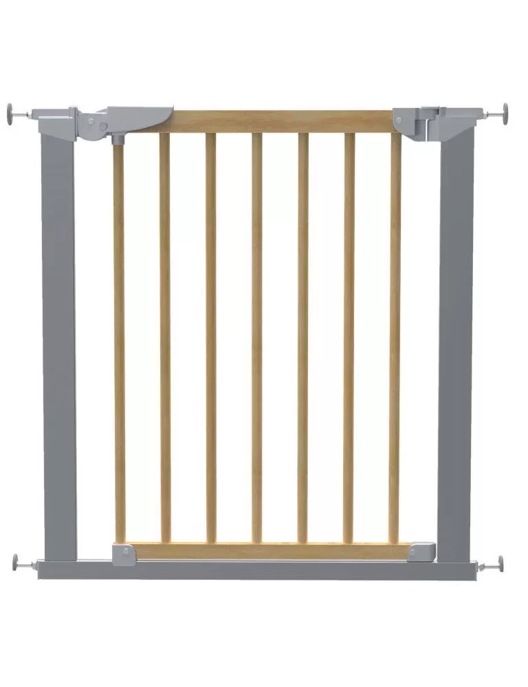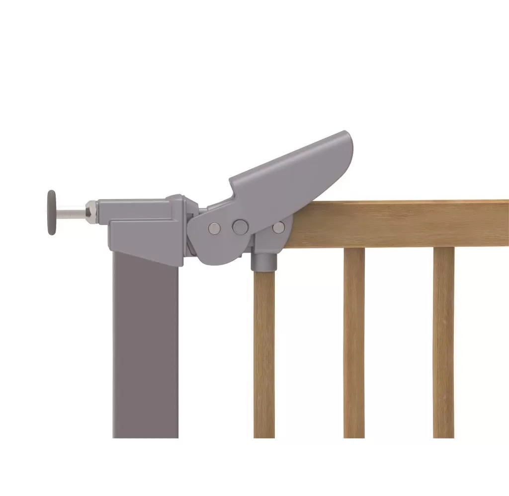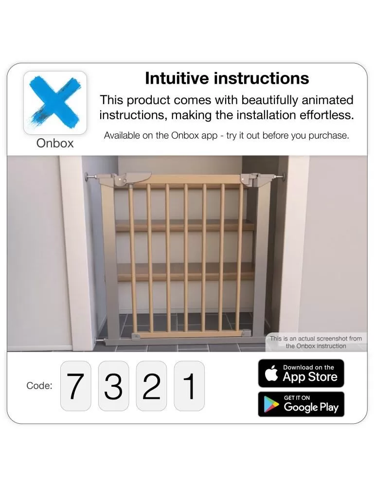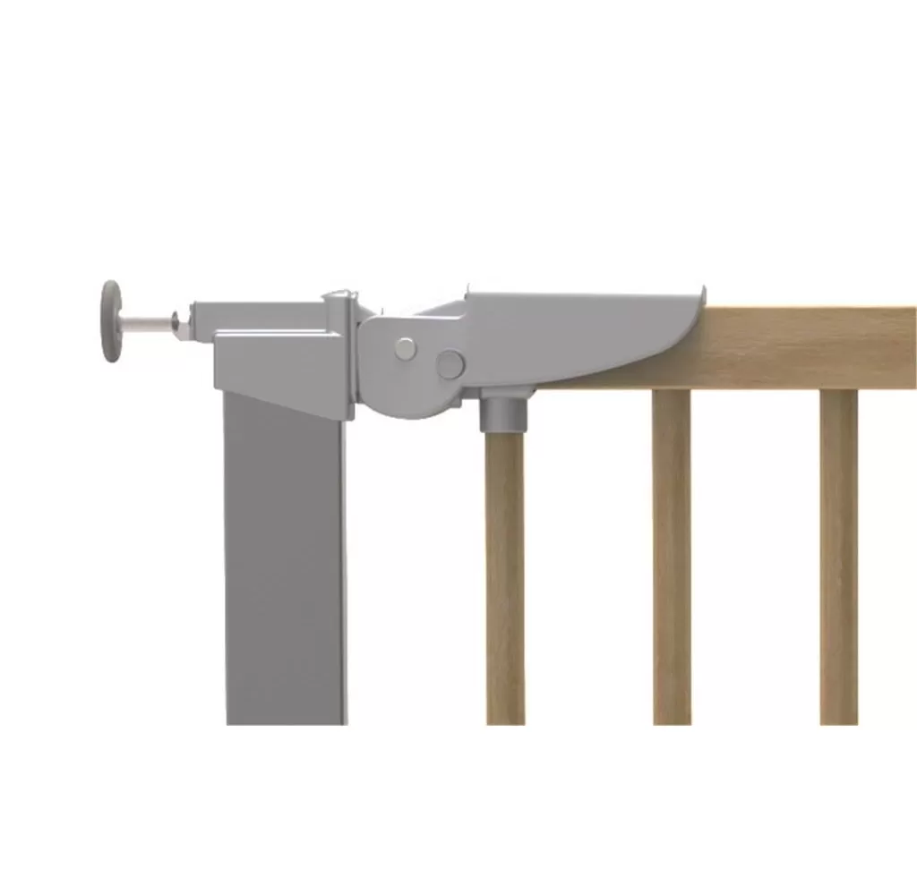 Unikátní tlaková montáž - není třeba vrtat ani připevňovat přídavné podložky na zeď. Po demontáži nezanechává žádné stopy. Třístupňový bezpečnostní mechanismus zajišťuje, že dítě zábranu náhodně neotevře. Třístupňový indikátor tlaku ukazuje, zda nastavení šroubů a tuhost stěn při instalaci zajišťují bezpečnost.
