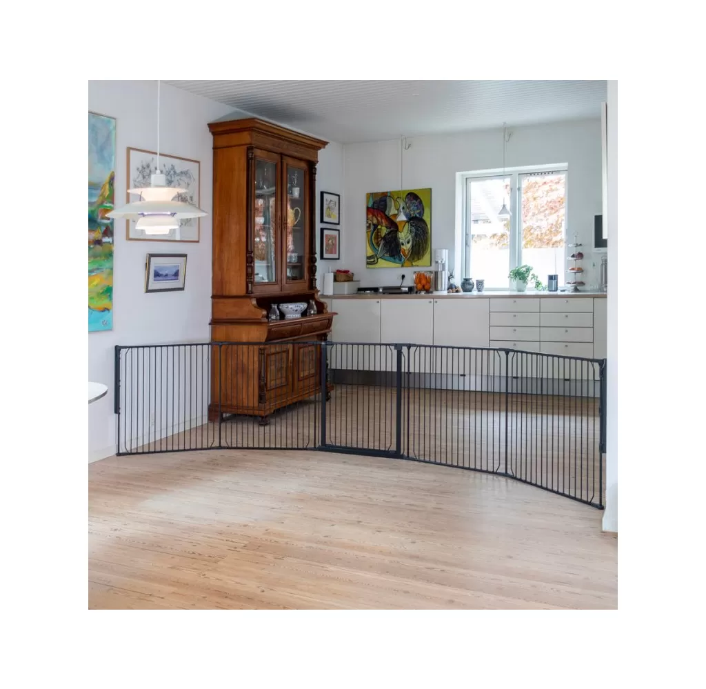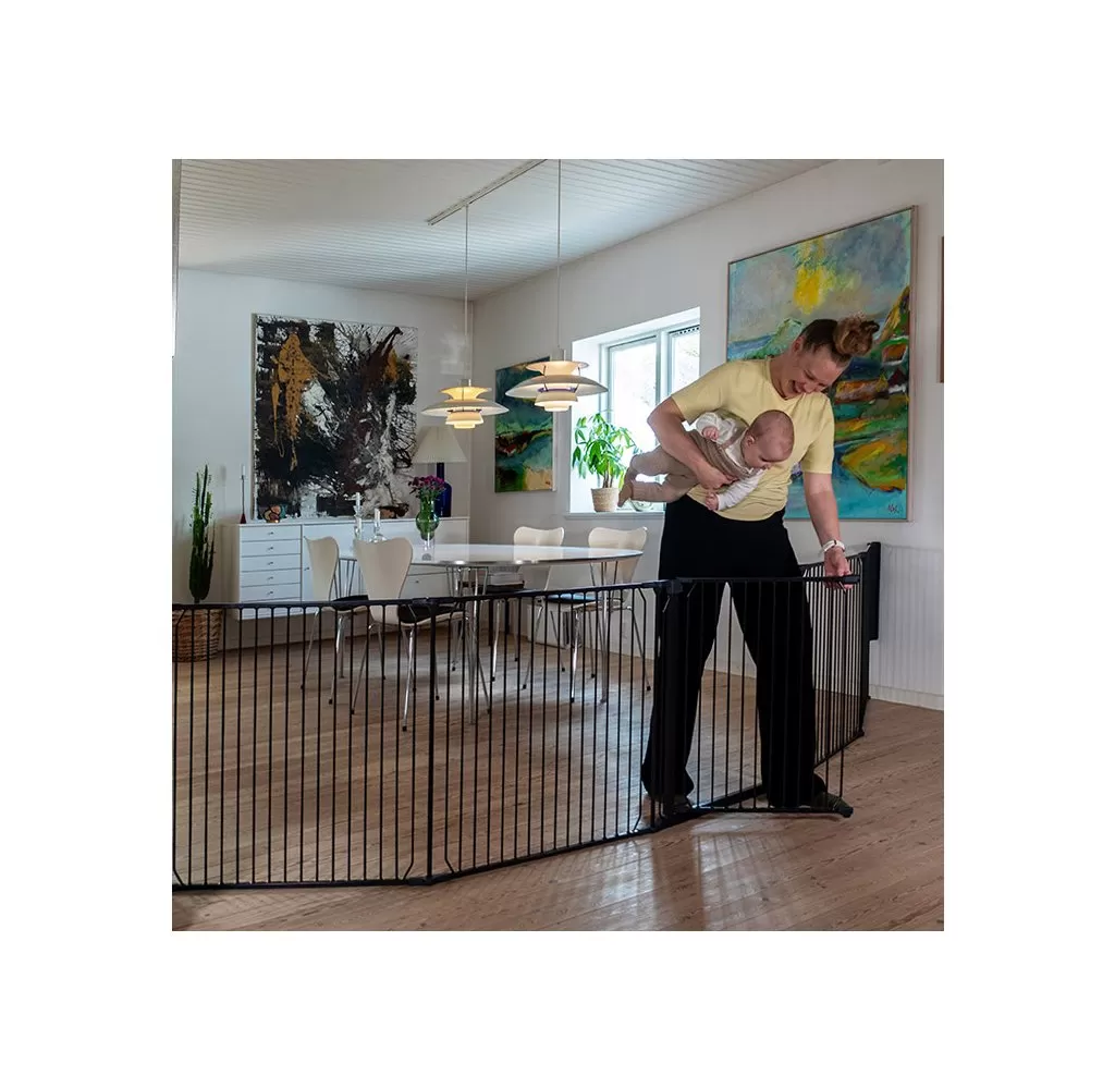 CombiFit XXL je navržen s ohledem na flexibilitu. Zábranu lze nastavit do různých úhlů, aby se přizpůsobila tvaru místnosti – ať už chcete tvar půlměsíce nebo mírně zakřivenou konstrukci. Máte volnost v umístění jednotlivých dílů tak, aby co nejlépe vyhovovaly vašemu prostoru. Zábranou můžete snadno projít pomocí širokých dveří, které lze otevřít z obou stran jednou rukou – užitečná funkce v uspěchaném životě. Díky svému flexibilnímu designu a robustní konstrukci je BabyDan CombiFit XXL spolehlivým řešením pro vytvoření bezpečného prostředí ve větších prostorách. Lze neomezeně prodlužovat pomocí libovolného počtu prodloužení (33 nebo 72 cm prodloužení se prodávají zvlášť)