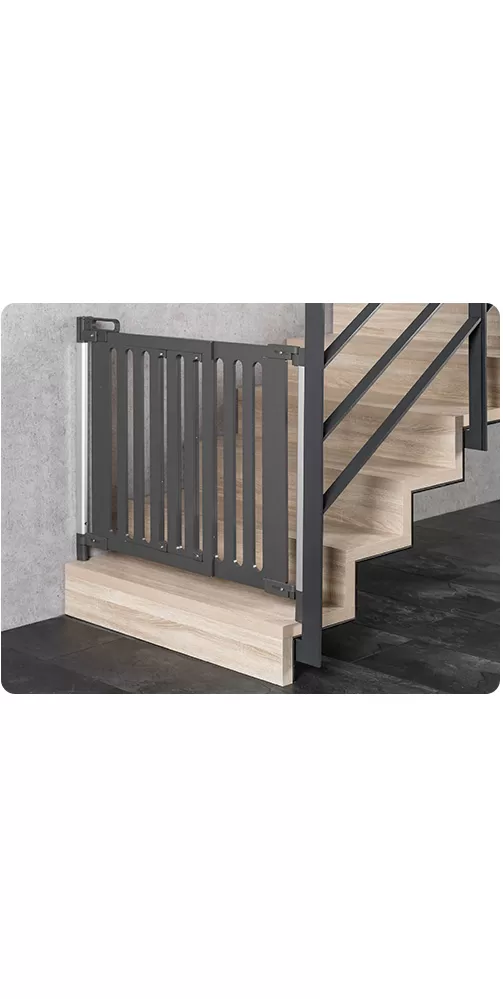 Zábrana Trend nevyžaduje upínací rám. Umožňnuje tak bezbariérový průchod a je ideální pro montáž na vrchní část schodiště. Prvek dveří lze zcela otevřít v obou směrech. K dispozici je zarážka pro omezení směru otevírání.
