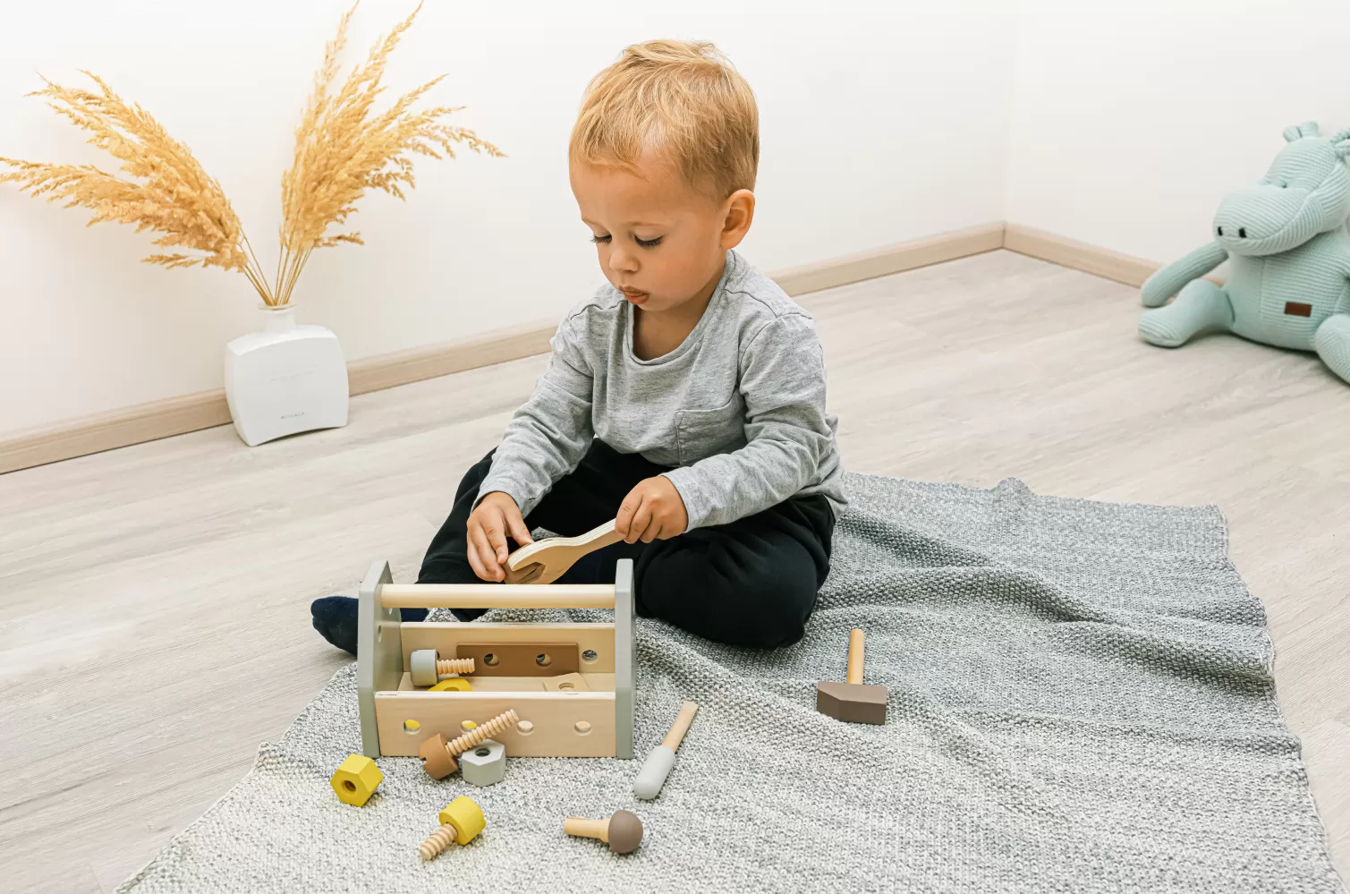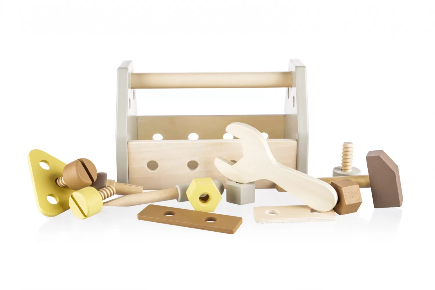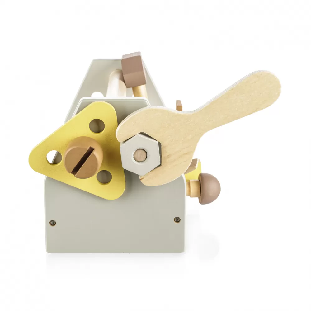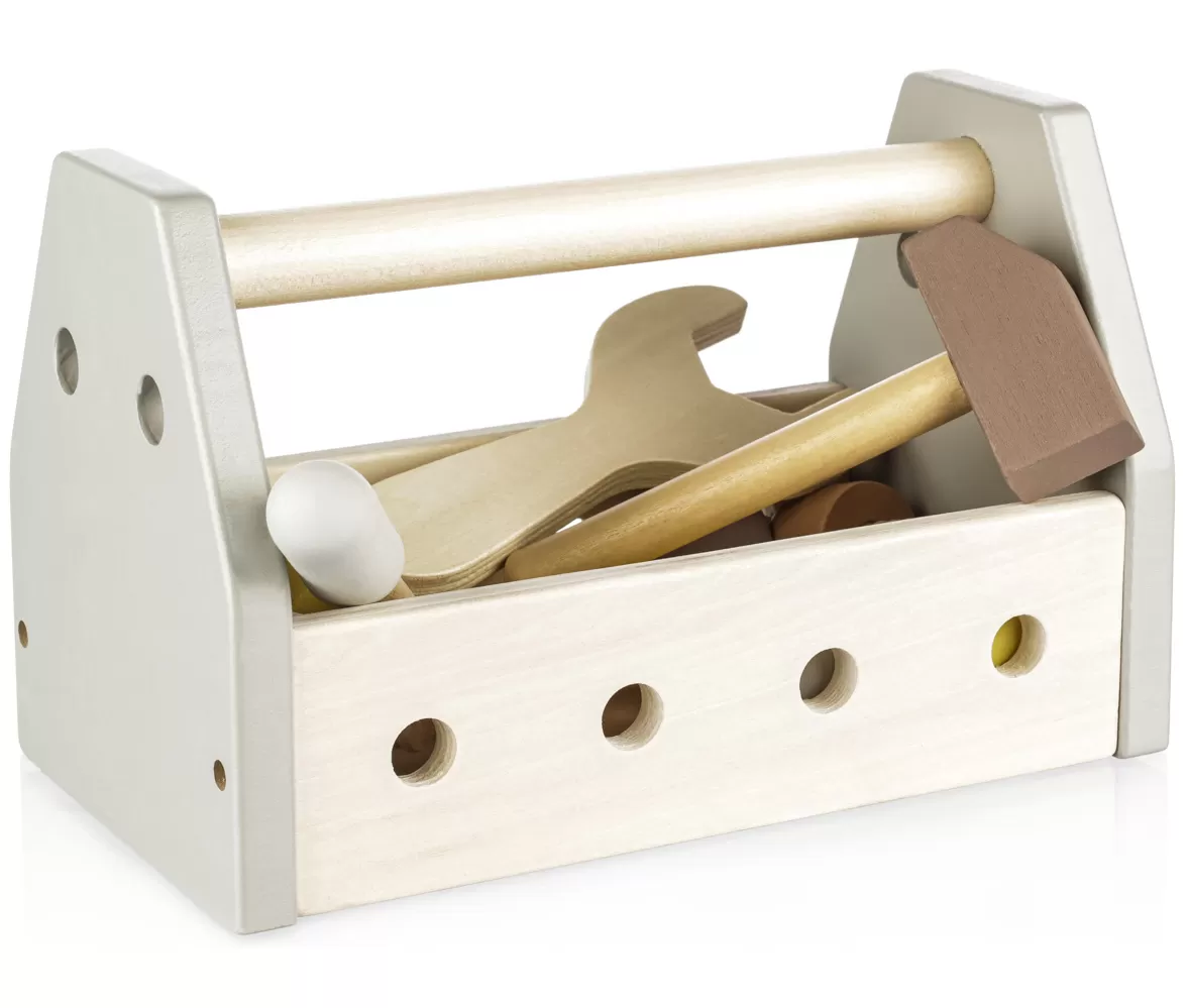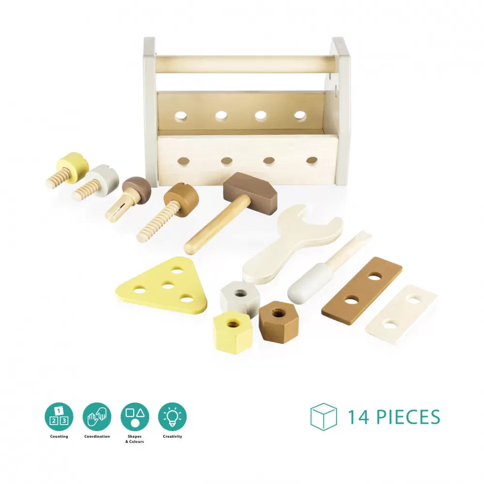 Možnosti hraní jsou neomezené – dítě může s nářadím tvořit i spravovat. Sada nářadí rozvíjí kreativitu, motoriku, koordinaci, schopnost třídění a řešení problémů. Hračka je vyrobena z přírodního bukového dřeva a barev na vodní bázi.