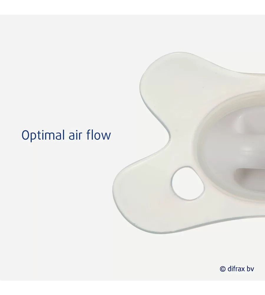 Unikátní dudlík Difrax má kotouč ve tvaru motýla, který zajistí, že dudlík dokonale padne tvaru obličeje vašeho miminka. Vykrojení kotouče umožňuje miminku volné dýchání nosem. Dva přídavné otvory zabezpečují dostatečný průchod vzduchu, čímž omezují možnost podrážení pokožky miminka. Difrax dudlíky navíc velmi dobře vypadájí.