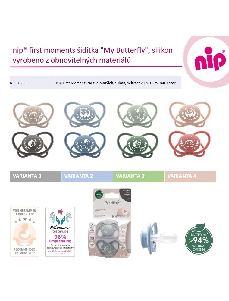 Stejně jako většina produktů značky nip® jsou i šidítka vyrobena se značkou "Made in Germany" a byla testována nezávislými porodními asistentkami a doporučena 96% (1).