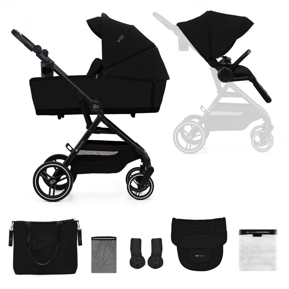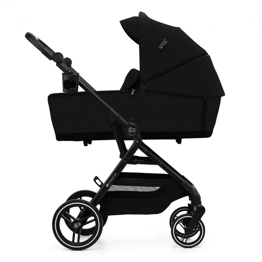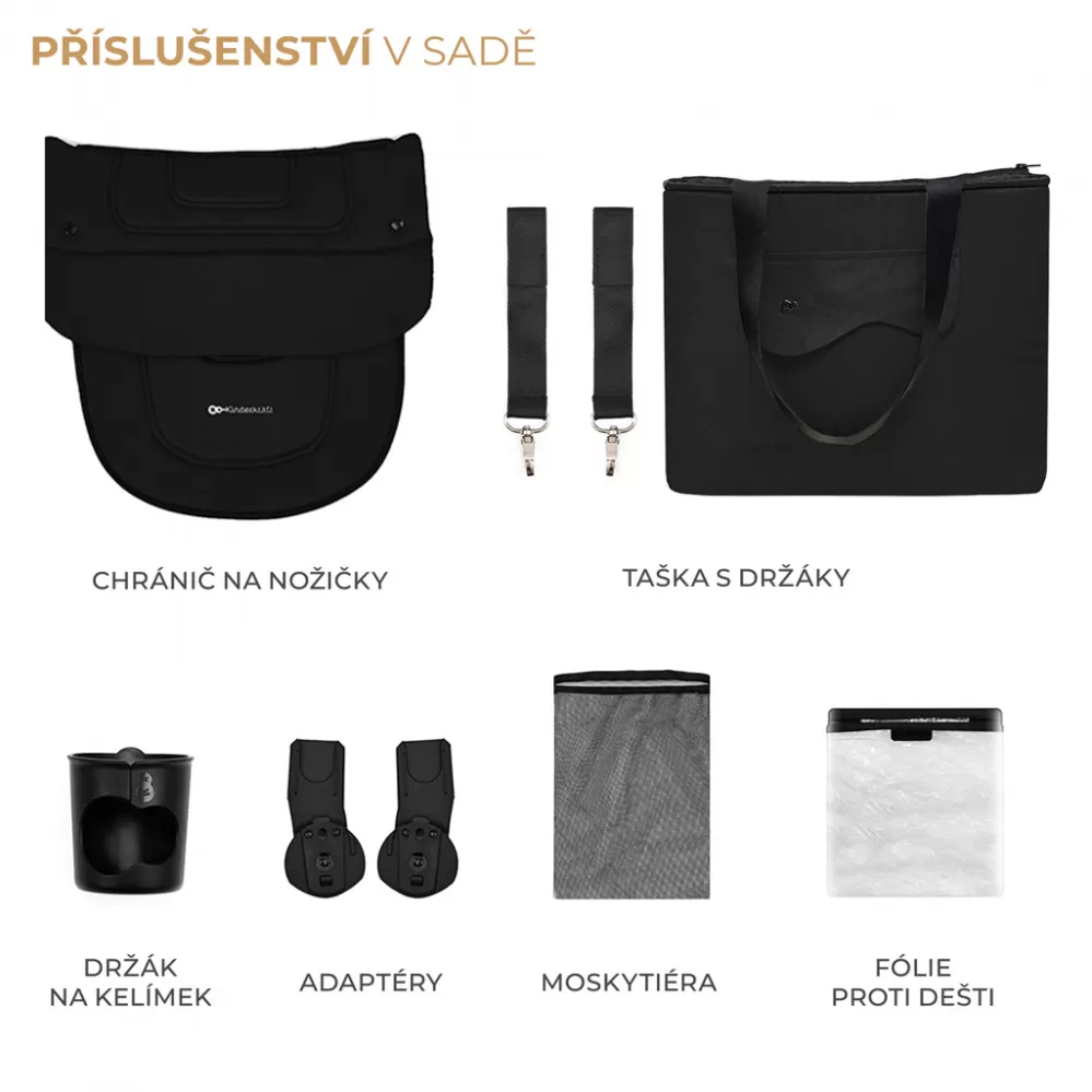 Objemný koš s nosností až 5 kg pojme veškeré potřebné příslušenství. Deka a pleny navíc? A co nákupy, které jste udělali po cestě domů? Snadný přístup z obou stran vám umožní rychle vytáhnout jakoukoli věc. Ke kočárku je dodáváno také příslušenství: moskytiéra (v opěrce nohou, kterou budete mít vždy s sebou), chrániče na nohy, pláštěnka, držák na nápoje, taška na rukojeť pro rodiče a adaptéry na autosedačku.