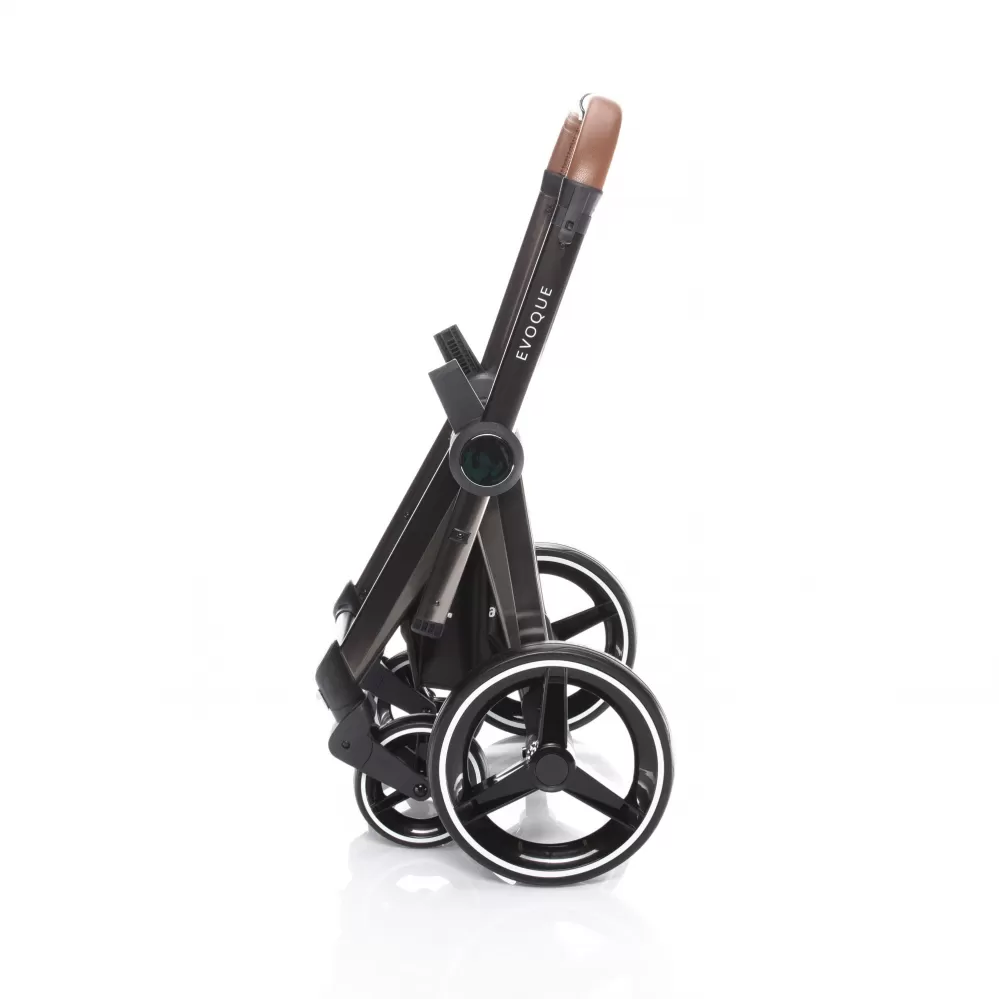 Samozřejmostí je pak výškově nastavitelná rukojeť, která je stejně jako odnímatelná hrazda potažena ekokůží. Kočárek lze snadno složit. Podvozek i ve složeném stavu sám stojí, proti rozložení ho jistí pojistka.
