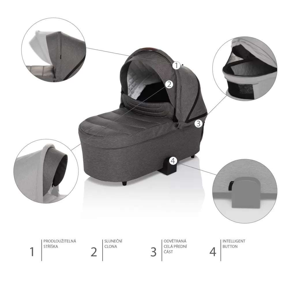 Hluboká korba Move XL má inteligentní, paměťová tlačítka (intelligent buttons), díky kterým se snadno oddělává z podvozku. Tlačítka lze zmáčknout postupně, vždy jednou rukou. Zůstanou v dané poloze, a rodič poté pohodlně pomocí madla sejme korbu z podvozku.