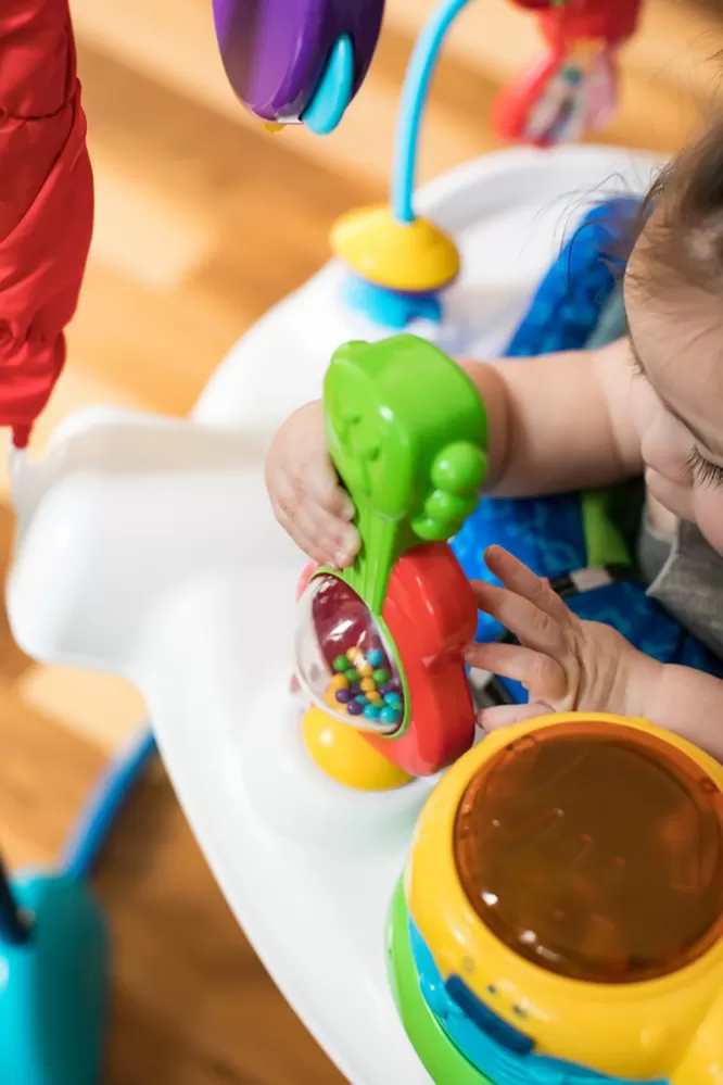 Nechte hudbu, aby se stala múzou vašeho dítěte a proměnila ho v malého umělce. Malé ručičky mohou klepáním na elektronické bubny bongo aktivovat světla, zvuky a několik jazyků. Dítě může otáčet klavírem ve tvaru válce a vydávat překvapivé zvuky nebo hrát na kytaru a roztančit barevné korálky. Bezpečné zrcátko s tamburínou podporuje sebepoznání dítěte. Toto jedinečné dětské hopsadlo se otáčí o 360°, takže váš malý hudebník může přecházet mezi jednotlivými aktivitami a zábava nikdy nekončí, protože stále objevuje nové činnosti.
