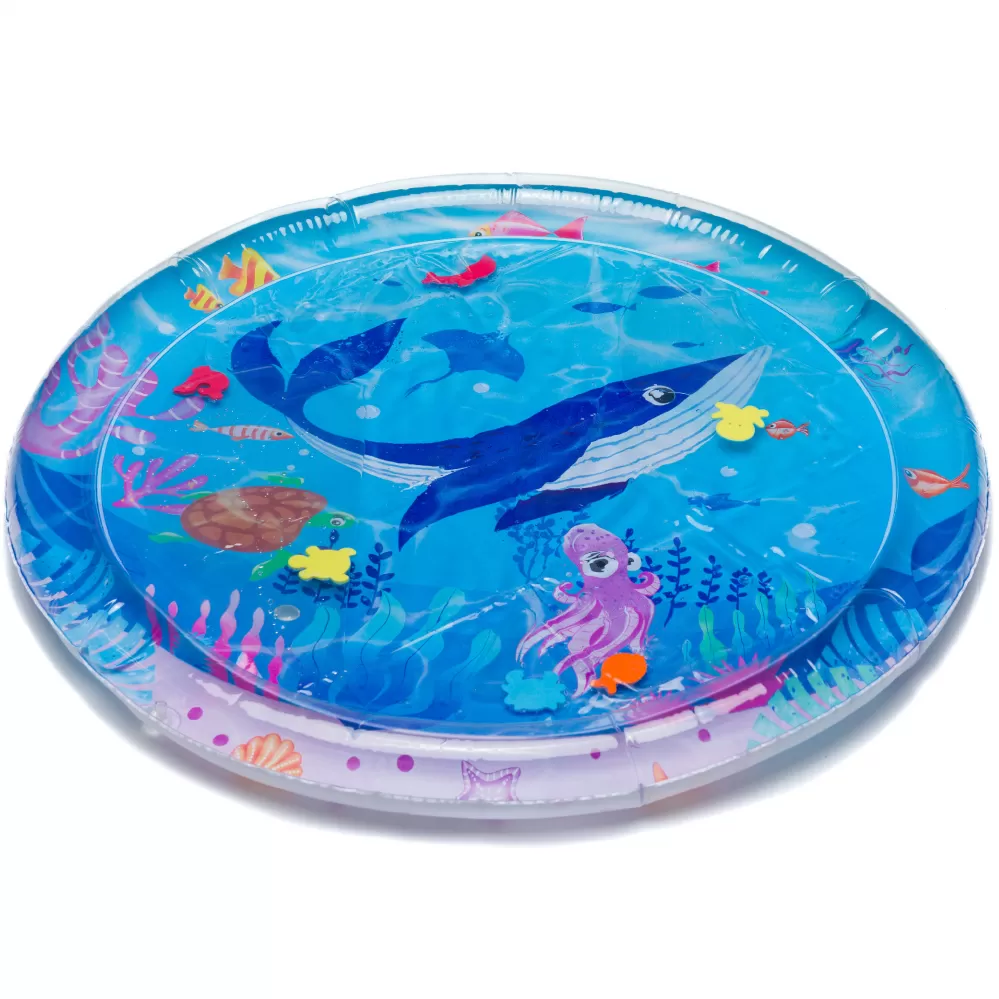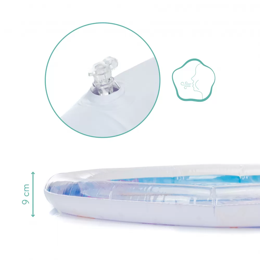 Měkká plocha naplněná vodou a nafukovací okraj zajistí, že vaše miminko leží bezpečně a pohodlně. Uvnitř plavou barevné motivy, které se při každém pohybu mění a motivují dítě k uchopování, zkoumání a objevování hravou formou. Podložka navíc podporuje zrakové vnímání, koordinaci oko–ruka a rozvoj motoriky.