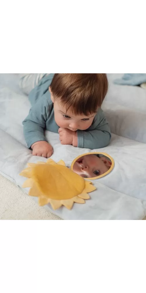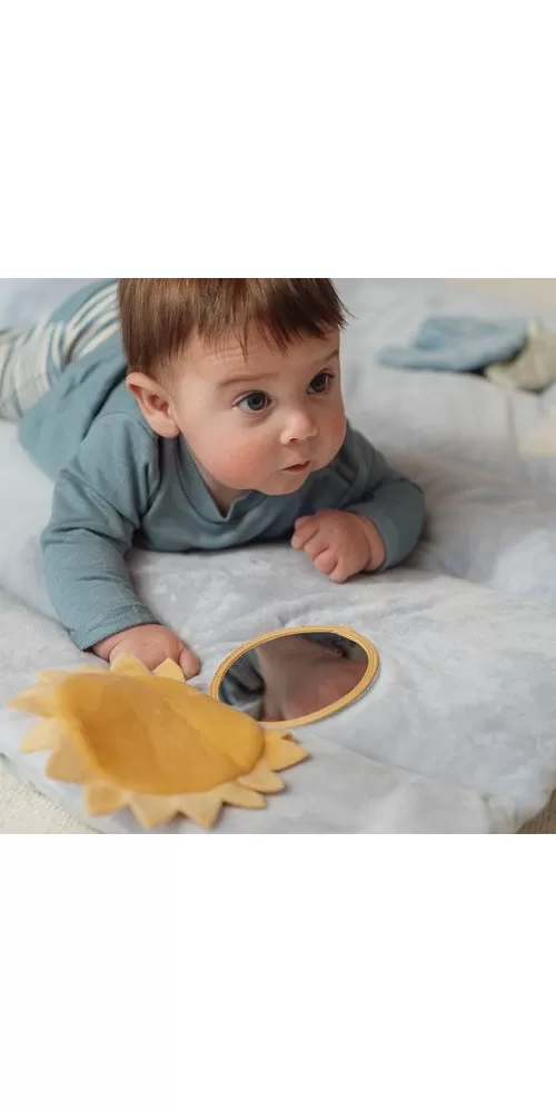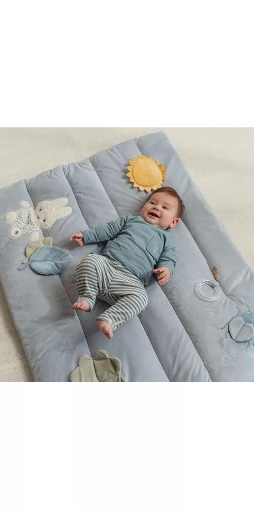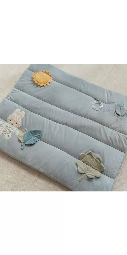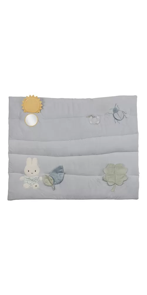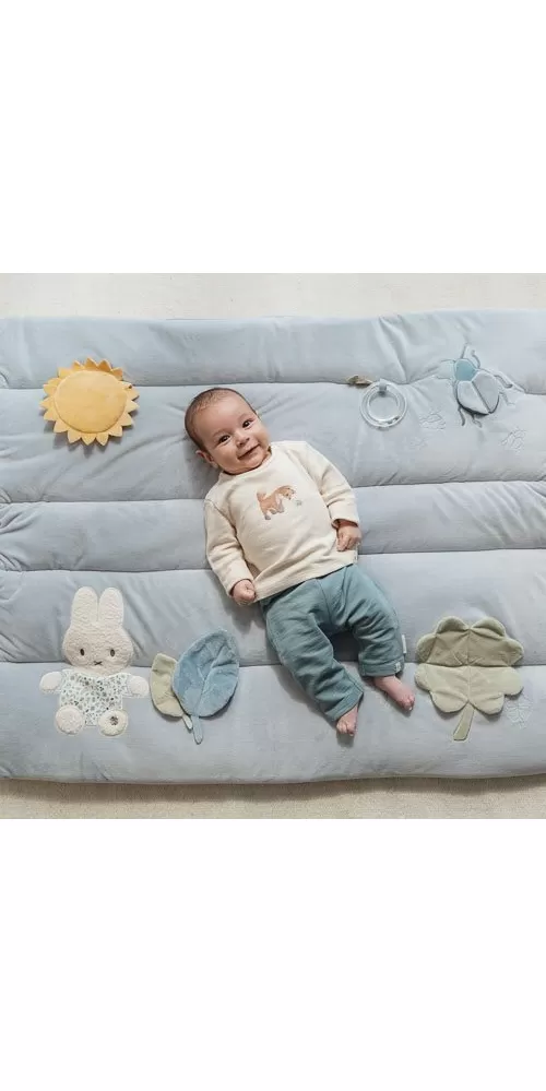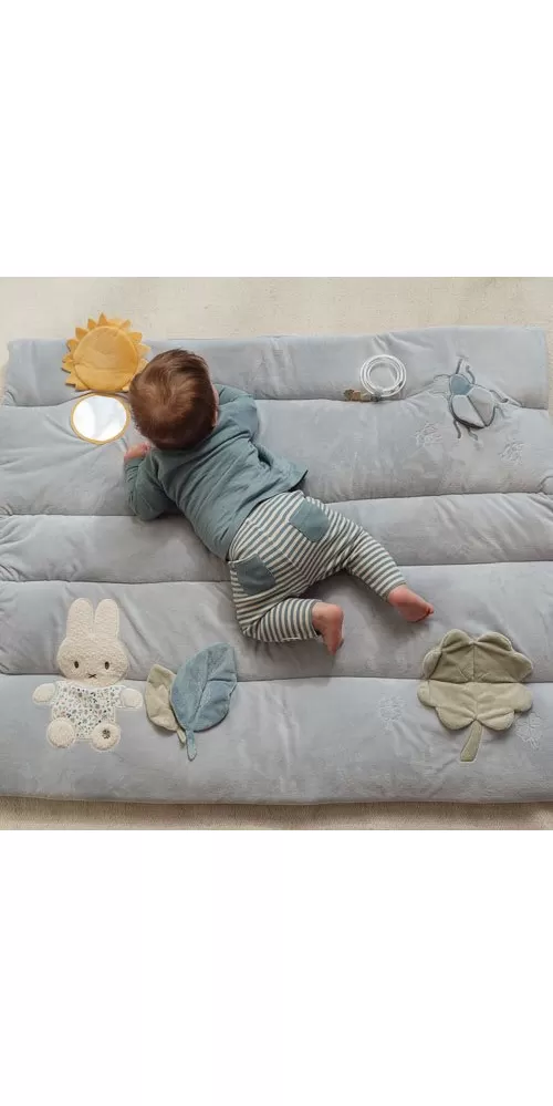 Měkká hrací deka nabízí pohodlí a různorodé aktivity pro zabavení vašeho dítěte. Na dece najdete plyšovou králičí holčičku Miffy, sluníčko s bezpečným zrcátkem, lístky, čtyřlístek s šusticími lístky, plyšového broučka i chrasticí kroužek.