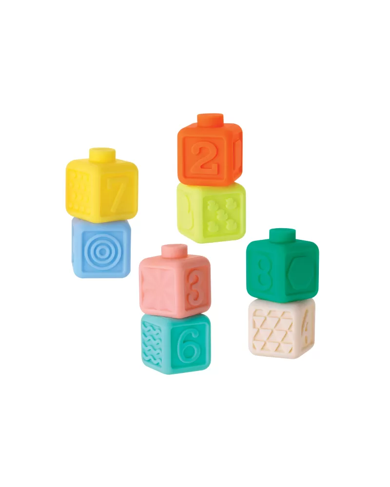 Měkké kostky v různých barvách a s různými texturami včetně čísel jsou propojitelné pro variabilní hraní. Pomáhají rozvíjet hmat i další smysly dítěte.