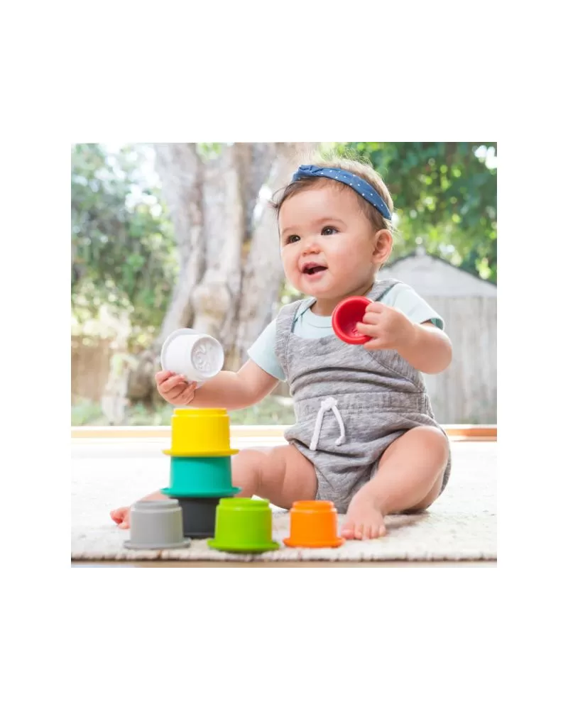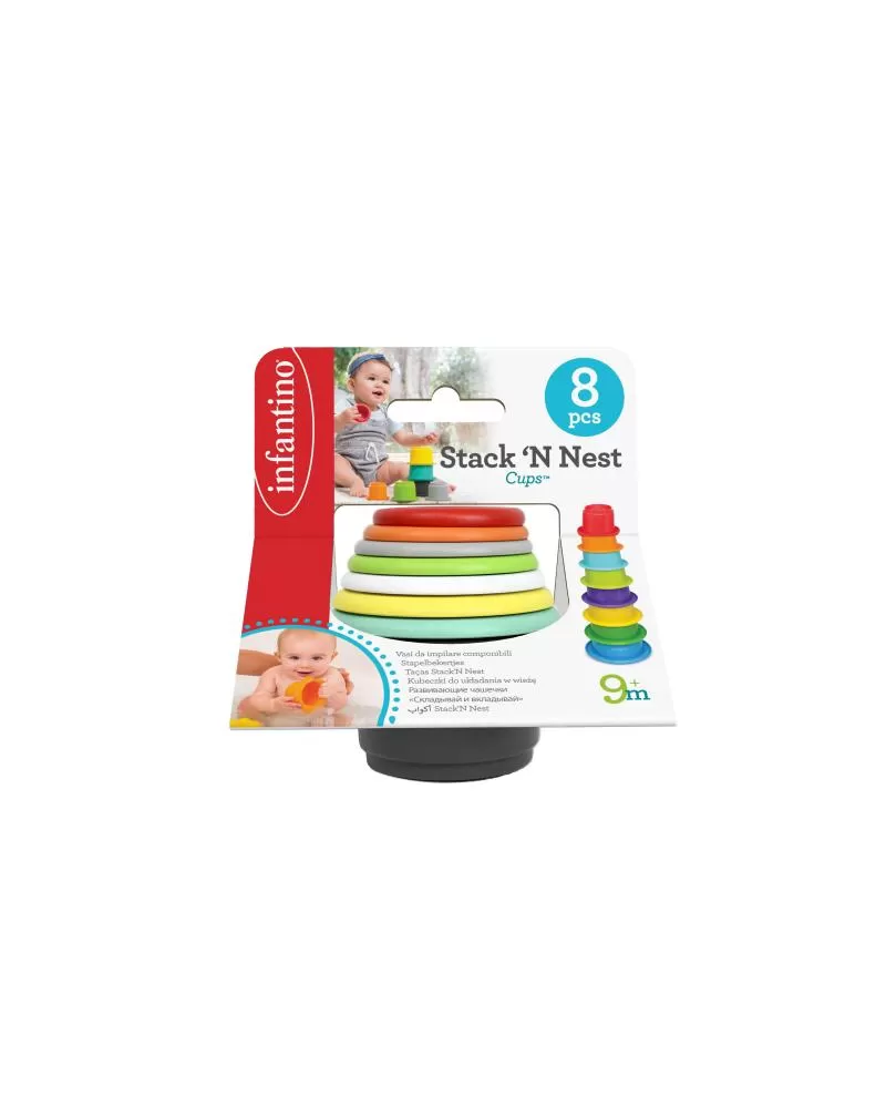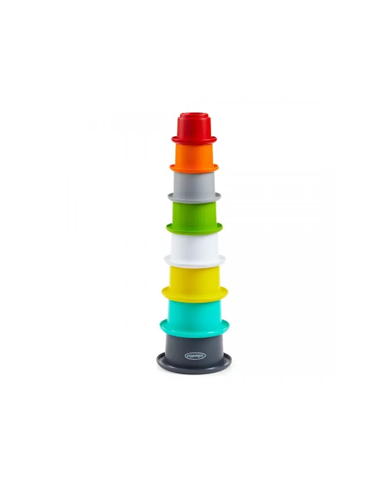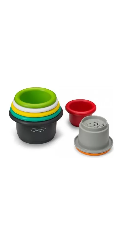 Osm různobarevných kelímků v originálním provedení má perforované dno s plastickým obrázkem zvířátka. Naučte dítě stavět z kelímků vysokou věž, kterou potom může jedním mávnutím ruky zase zbourat, poznávejte spolu zvířátka i barvy a nebo kelímky využijte pro hraní s vodou během koupele.