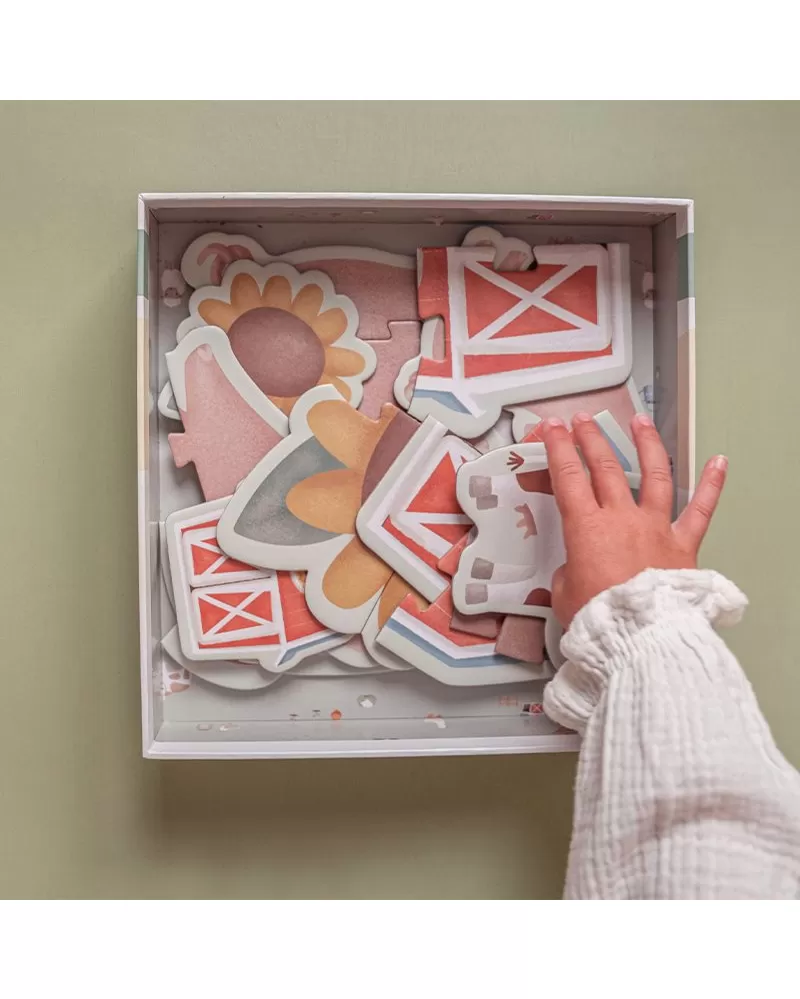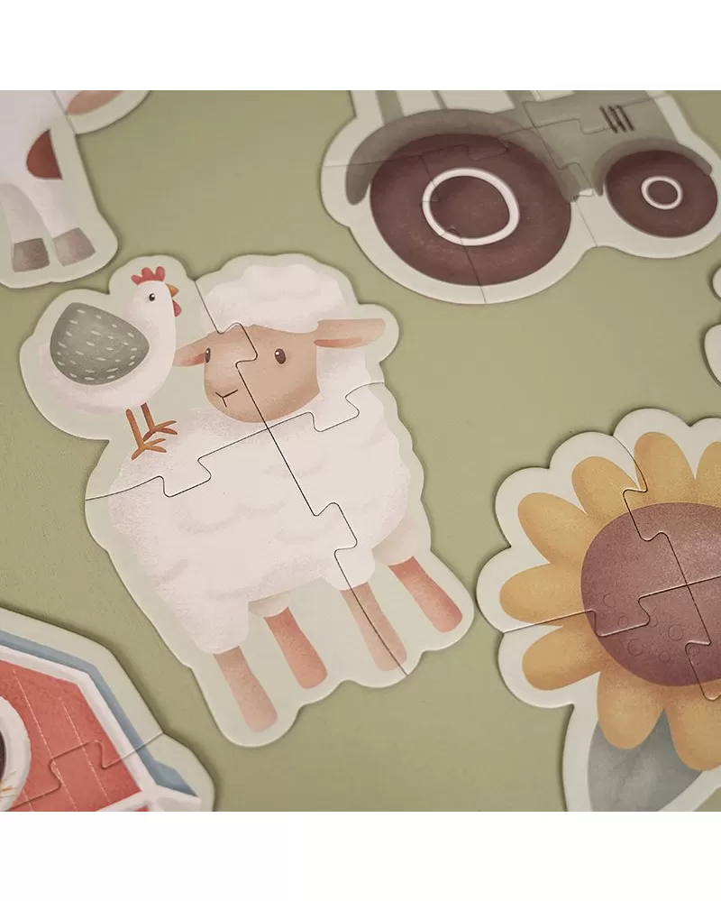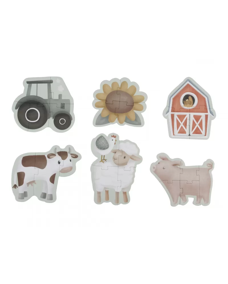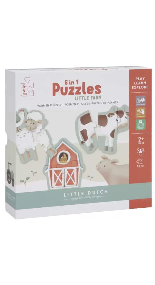Sada obsahuje 6 variant puzzle skládaček pro nejmenší s krásnými ilustracemi ze života na farmě. Jednotlivé skládačky mají 3, 4 nebo 5 dílků z pevného kartonu, které jsou dokonale tvarované pro malé dětské ručičky.