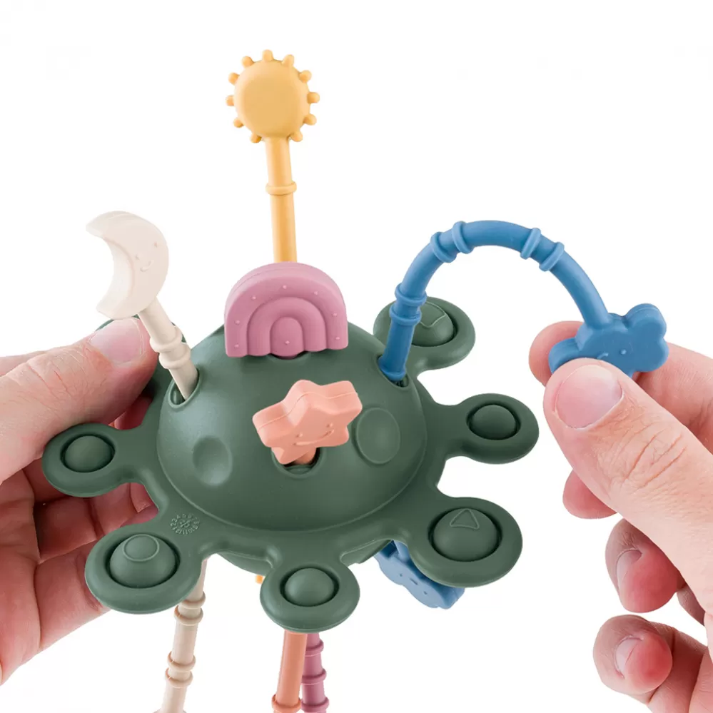 Nekonečná vesmírná zábava! Všestranná senzorická hračka ve tvaru planety Petite&Mars nejen stimuluje smysly, ale podporuje také rozvoj malých ručiček. Tato neobvyklá hračka může sloužit jako kousátko i jako nástroj pro rozvoj manuálních dovedností. Obsahuje mnoho prvků pro zkoumání: tlačítka na mačkání, silikonové šňůrky s různým stupněm obtížnosti při jejich tahání a zajímavé tvary související s atmosférickými jevy, což zaručuje dlouhotrvající a tvůrčí zábavu. Podporuje vývoj dětí tím, že stimuluje kognitivní schopnosti, rozvíjí kreativní myšlení a aktivuje všechny smysly. Tím, že umožňuje tahání texturovaných šňůr přes speciální otvory, vytváří zajímavé zvuky a vibrace. Pružná tlačítka se dají mačkat a přesouvat z jedné strany na druhou, což pomáhá rozvíjet jemnou motoriku a procvičuje zručnost prstů. Hračka je vyrobena z nejkvalitnějšího potravinářského silikonu, který zaručuje bezpečnost pro děti od 10 měsíců. Je navržena tak, aby zmírňovala nepohodlí dětských dásní a rozvíjela žvýkací schopnosti a zároveň podporovala cvičení úchopu. Hračka je vyrobena v souladu s metodikou Montessori, která podporuje aktivní, smyslové učení a samostatnost dítěte. Díky svým rozměrům je lehká a snadno se přenáší. Další výhodou je snadné čištění, díky kterému se stává praktickým a hygienickým prvkem pro každodenní hraní.