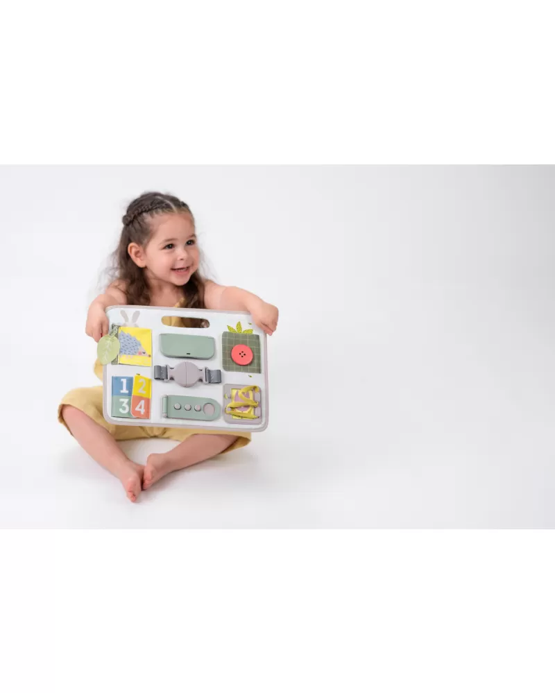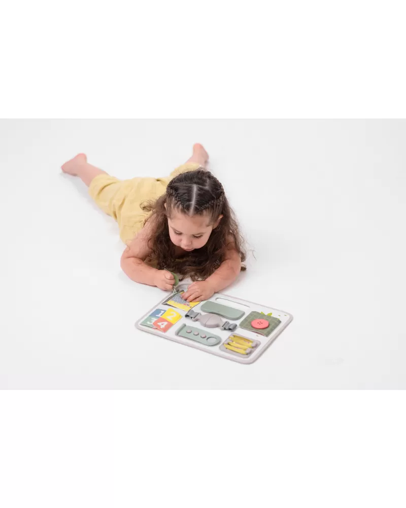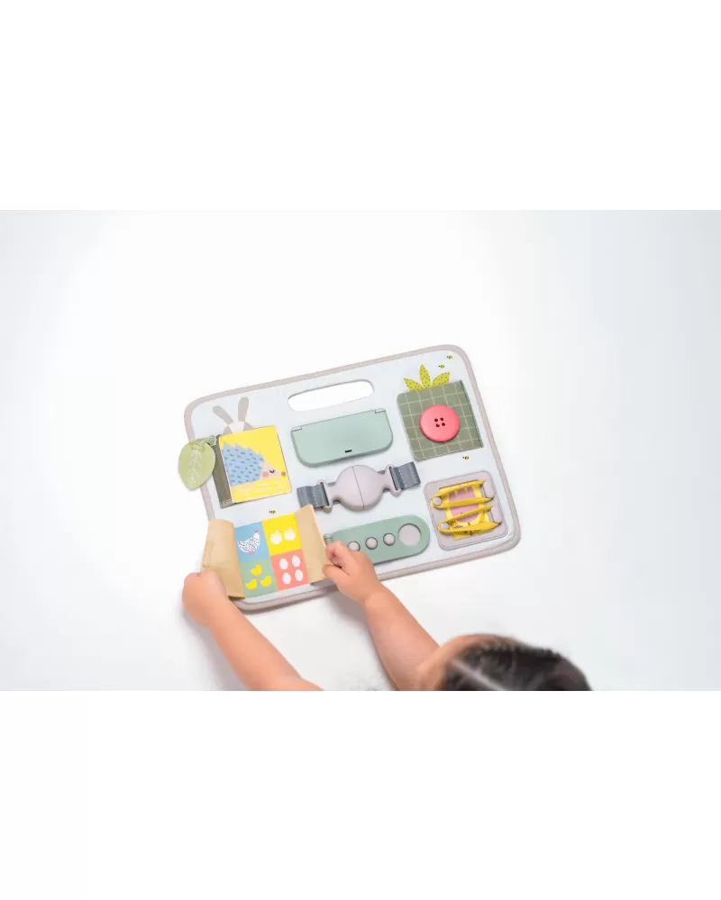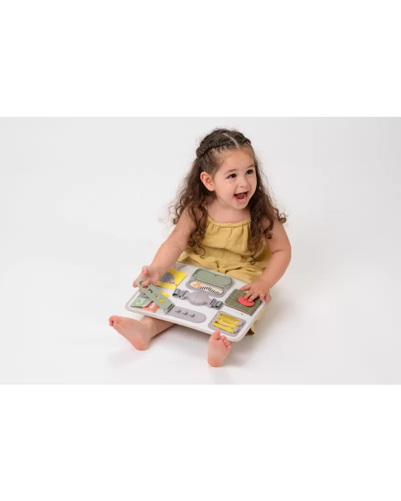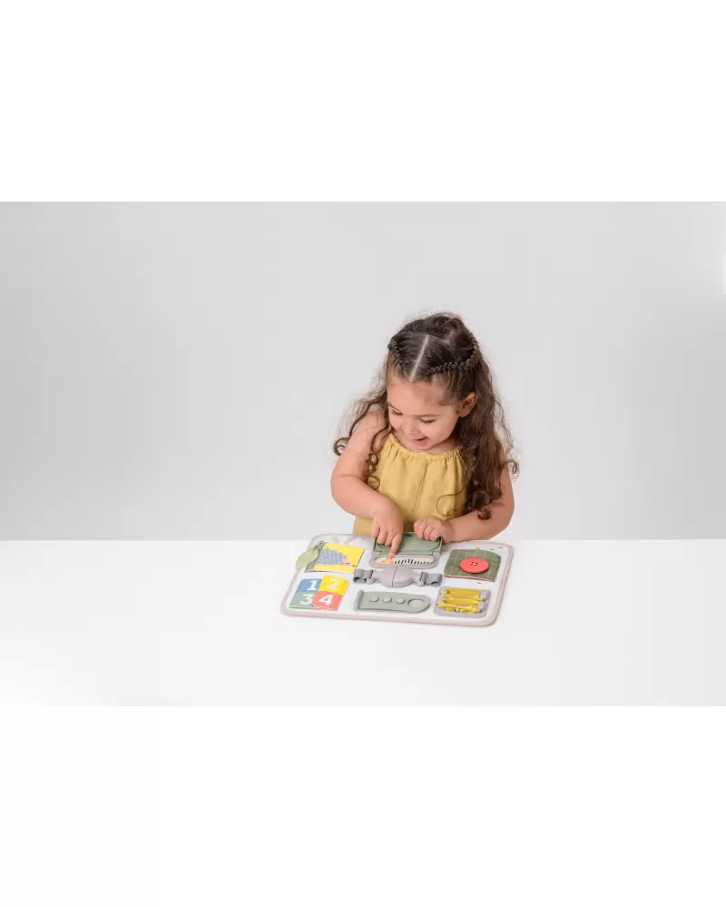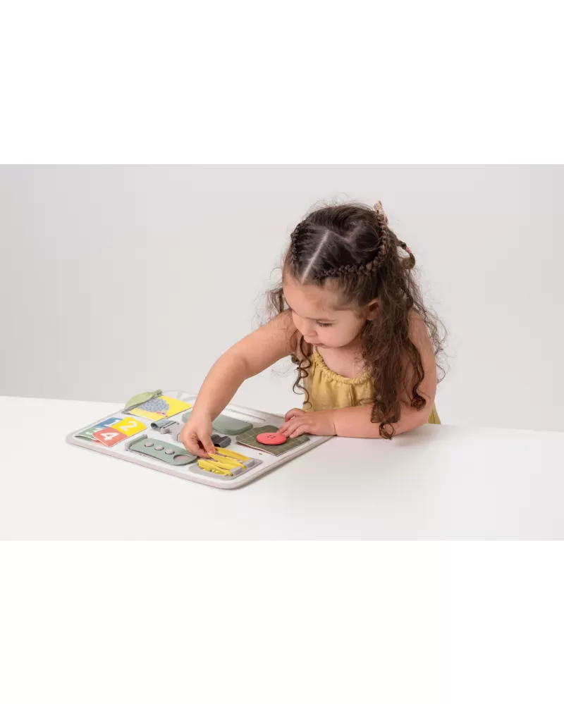 Originální hrací pult nabízí množství různorodých aktivit, mezi kterými najdete zip, velký knoflík, suché zipy tkaničky, přezku, poutko a mnoho dalšího. Zapínáním a rozepínáním si děti procvičují jemnou motoriku i koordinaci oko-ruka. Aktivity zároveň podporují rozvoj kreativity dítěte i jeho schopnosti řešit problémy.