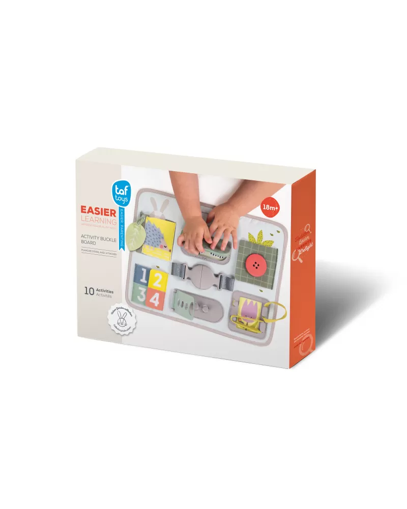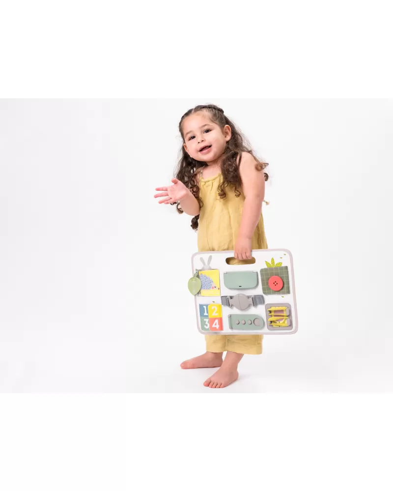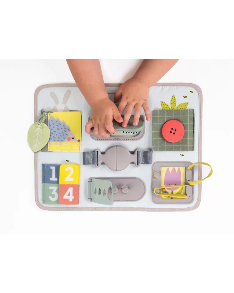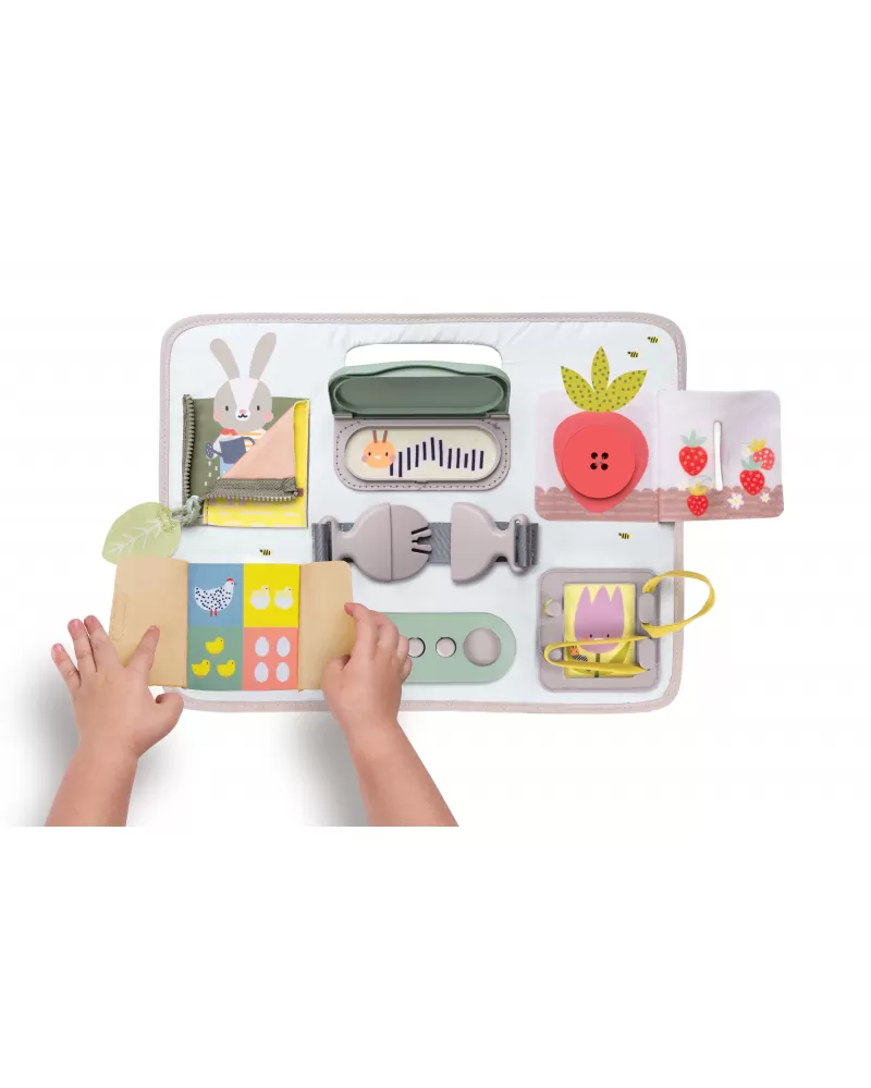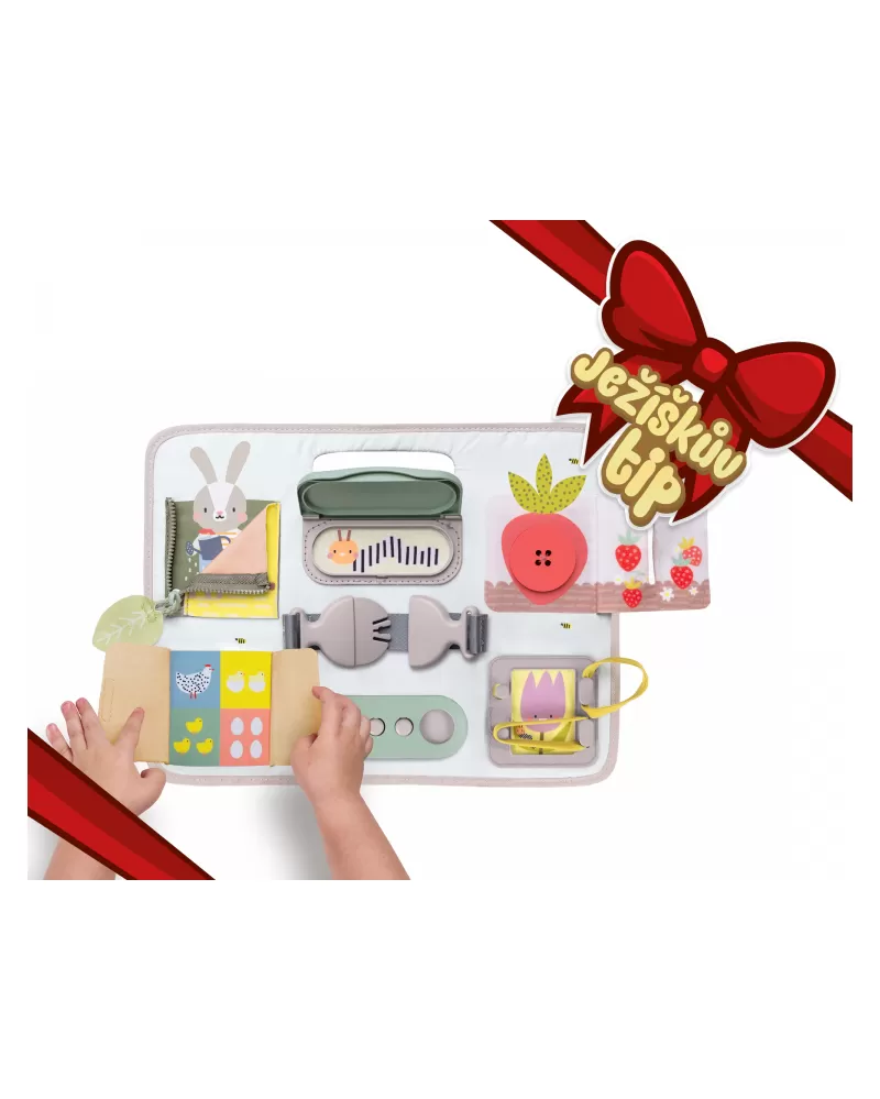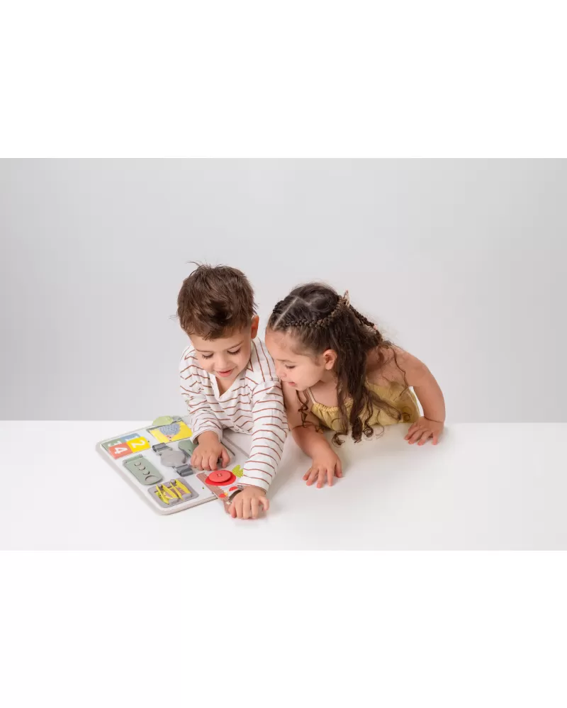 Originální hrací pult nabízí množství různorodých aktivit, mezi kterými najdete zip, velký knoflík, suché zipy tkaničky, přezku, poutko a mnoho dalšího. Zapínáním a rozepínáním si děti procvičují jemnou motoriku i koordinaci oko-ruka. Aktivity zároveň podporují rozvoj kreativity dítěte i jeho schopnosti řešit problémy.