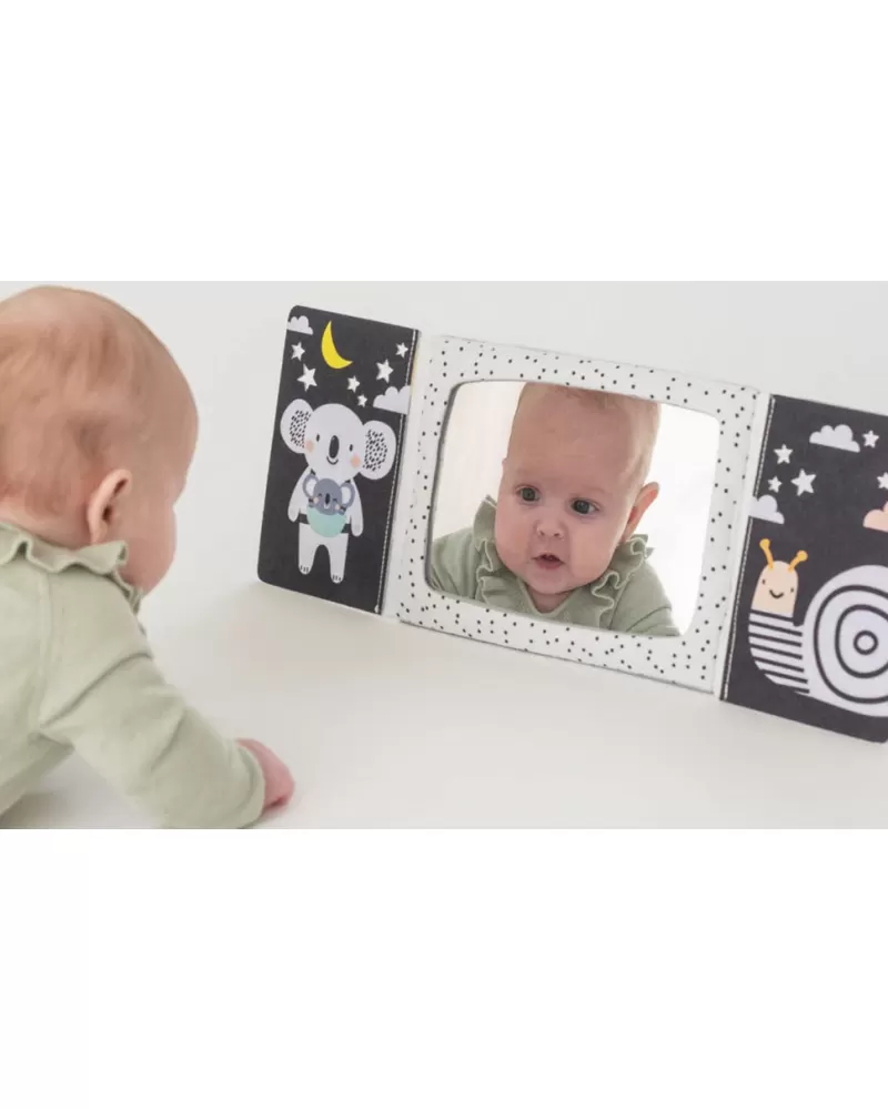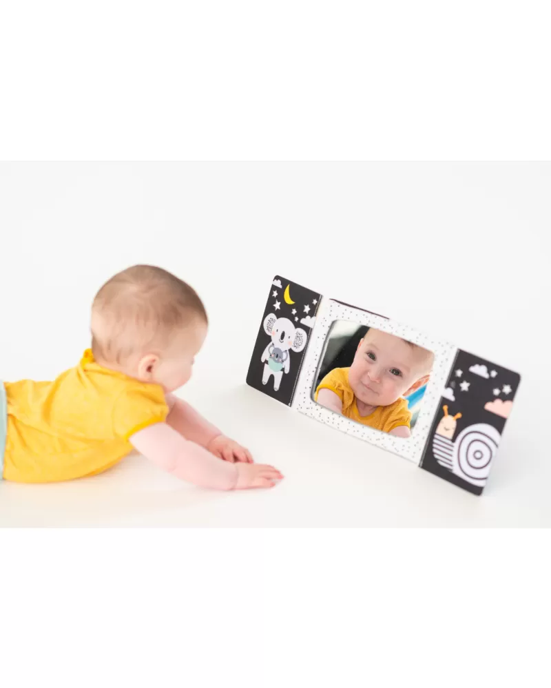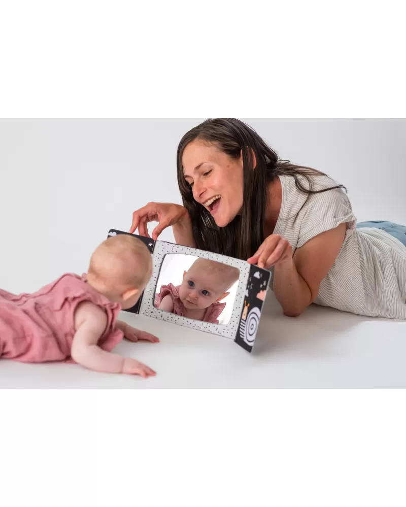 Zrcátko pomáhá dítěti učit se sebeuvědomění a podněcuje rozvoj jeho zraku a komunikačních dovedností. Zrcátko zakryté chlopněmi knihy lze využít i pro oblíbenou schovávací hru Peek-A-Boo mezi rodičem a dítětem.