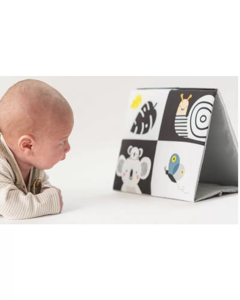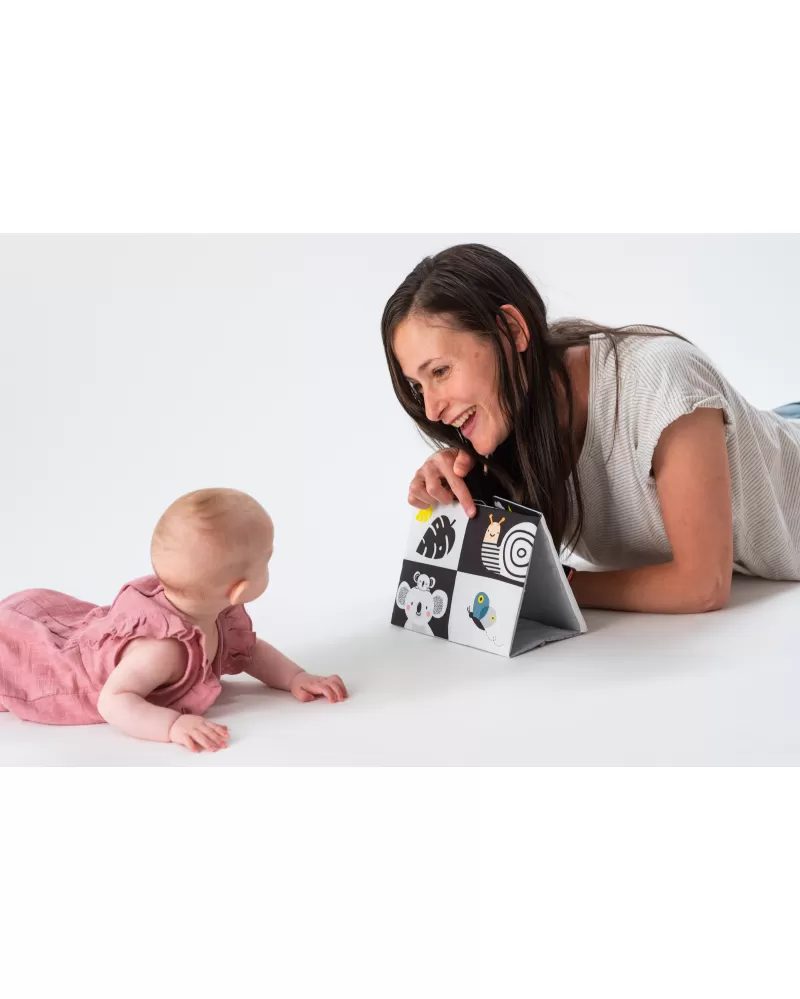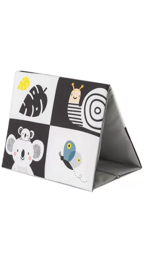 Textilní knížka ve tvaru stolního kalendáře je ideální pro postavení před dítě při hře na bříšku. Neodolatelné vysoce kontrastní obrázky a bezpečné velké zrcátko upoutají pozornost dítěte a pomáhají tak zabavit dítě při hře na bříšku.