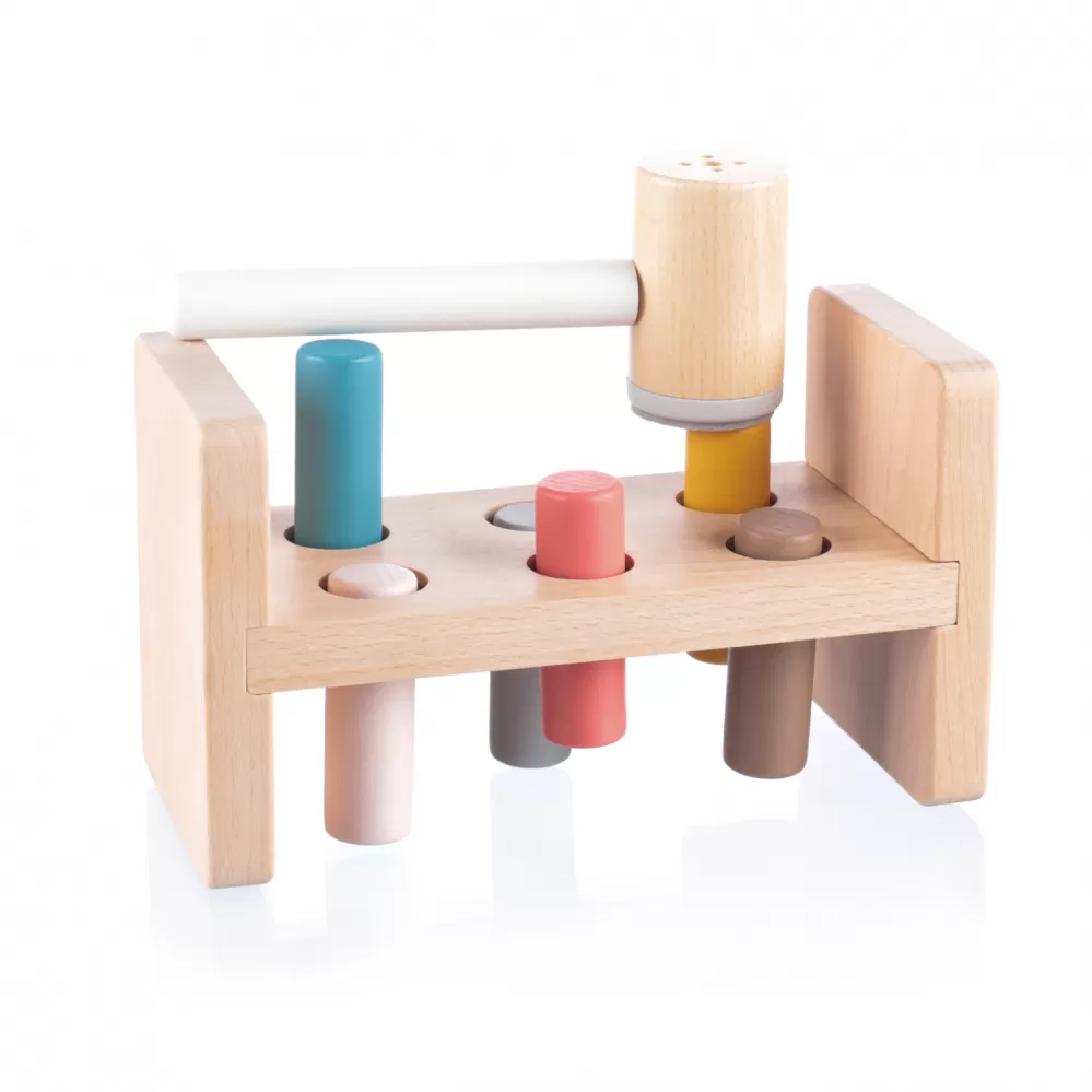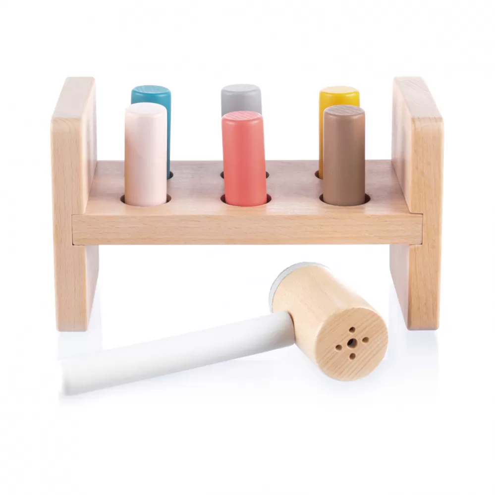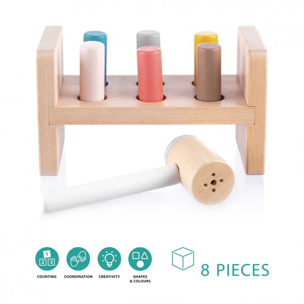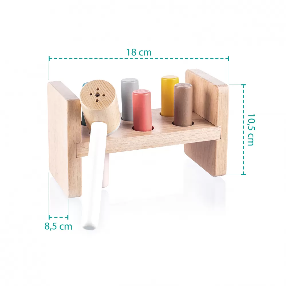 Dřevěná zatloukačka pro malé děti, která je zabaví na dlouhé hodiny. Obsahuje dřevěný stolík s otvory, 6 pestrobarevných kolíků a kladívko. Když je kolík umístěn do otvoru a zatluče se, kladívko vydává příjemný zvuk. Kolíky lze zatloukat z obou stran stolíku.