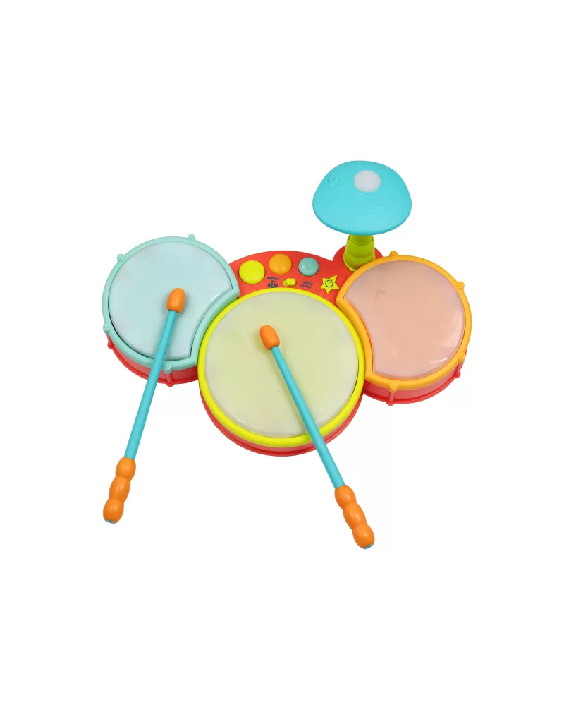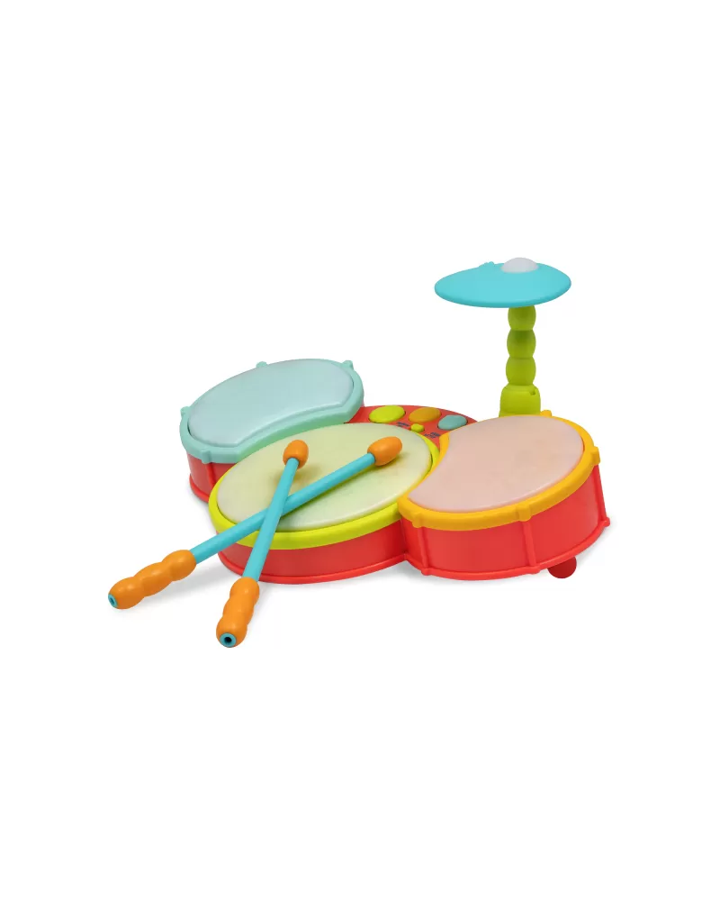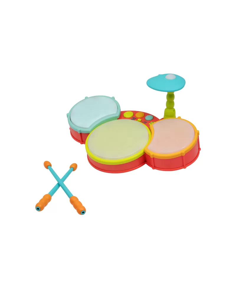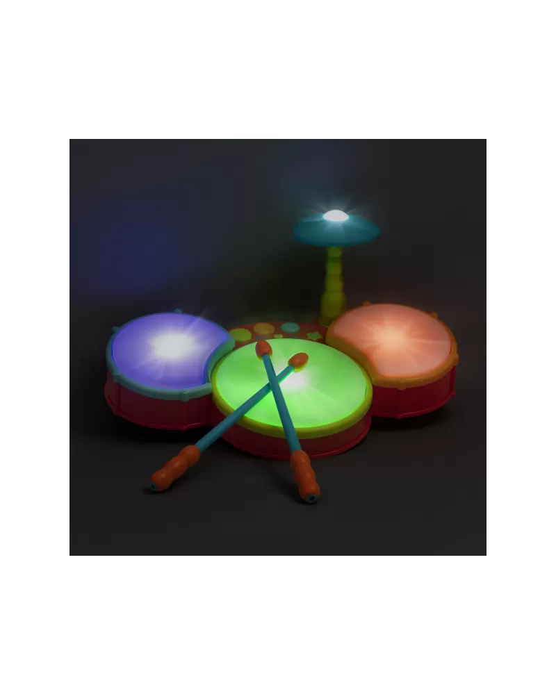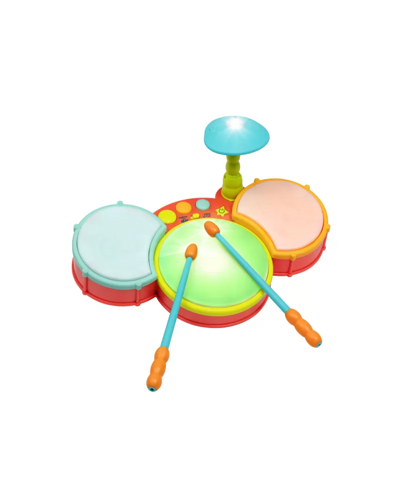 Barevná svítící bicí souprava pro malého bubeníka nabízí různé způsoby hraní. Děti mohou bubnovat ve vlastním rytmu nebo podle toho, jak se jednotlivé bubínky rozsvěcují. Vlastní bubnování mohou doplnit různými druhy přednahraných zvuků, které bicí souprava nabízí. Rodiče potěší možnost nastavení hlasitosti.