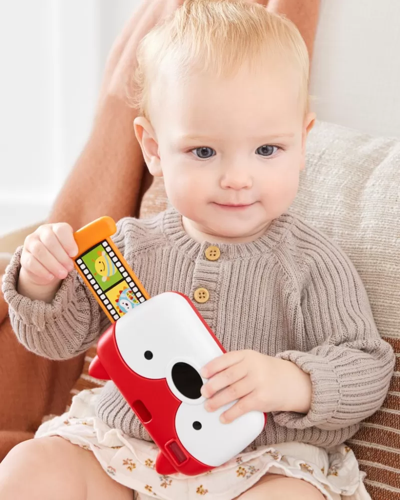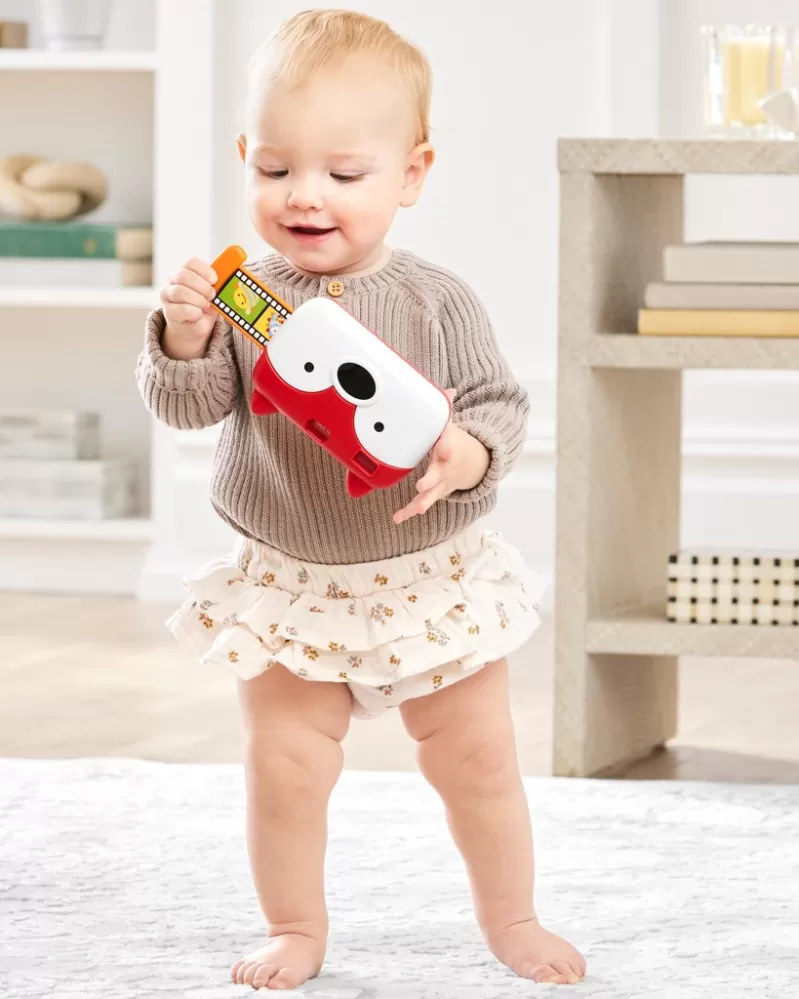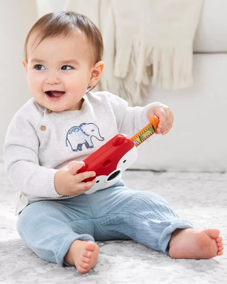 Vlastnosti: - 4 zábavné zvuky: cvaknutí závěrky, bum!, chichotání a klakson. - Realistické blikající světlo. - Stiskněte ucho pro zvuky a světla. - Dětské zrcadlo podporuje sebepoznávání. - Výsuvná "fólie" s charakteristickou kresbou Skip Hop. - Otvor pro hledáček. - Lehce se drží v malých rukou. - Věk 6m+. - Ladí s kolekcí Skip Hop Explore & More™