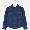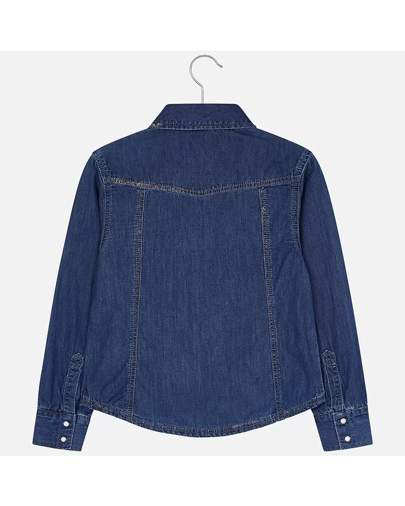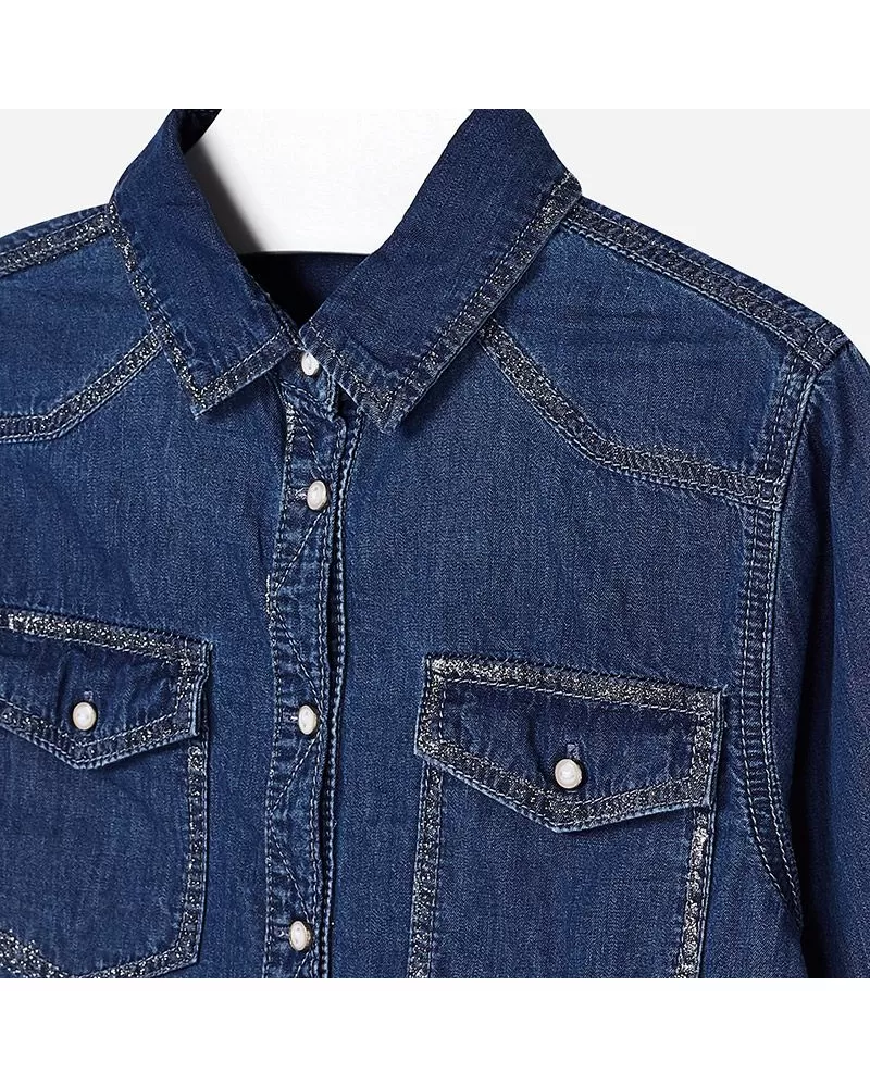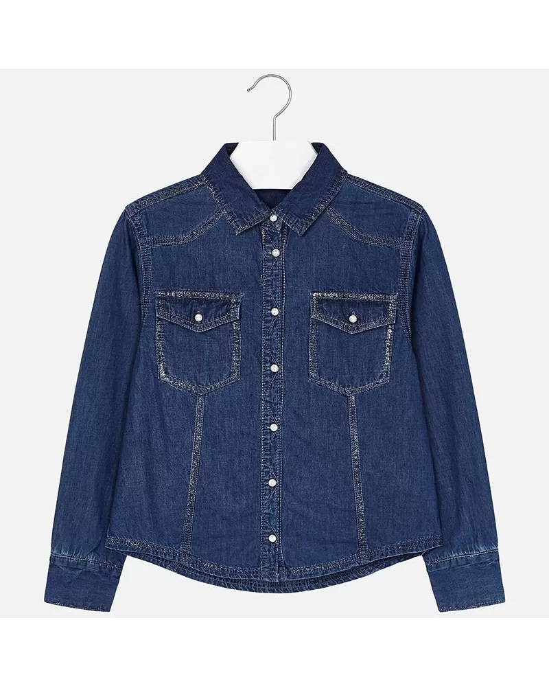 Krásná tmavě modrá JEANS košile dlouhý rukáv pro holčičku od kvalitní značky MAYORAL. Moderní košile s ozdobnými rukávky, kapsičkami a stříbrným lemováním.
