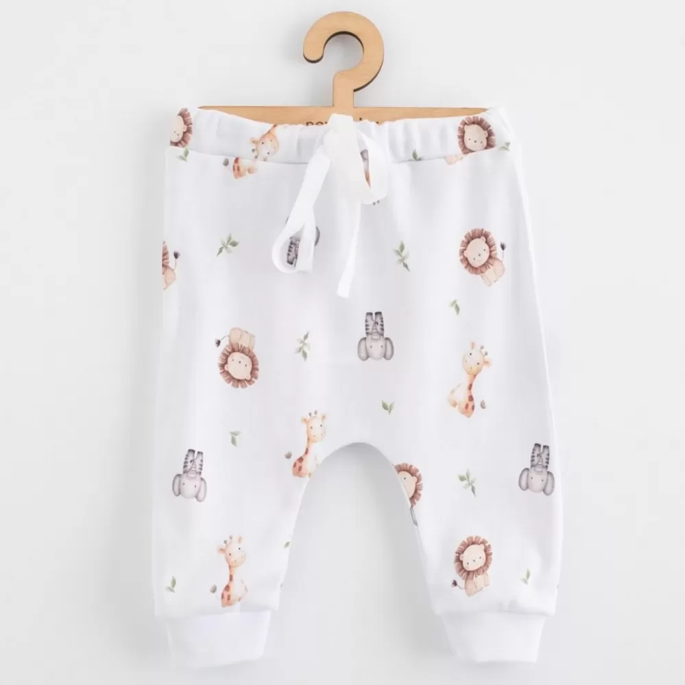 Kojenecké kalhoty jsou celopotištěné nápaditým dětským motivem. Pro snadné oblékání mají v pase gumičku, která netlačí a všitý ozdobný pásek na zavazování. Na hohavičkách jsou našité širší lemy.