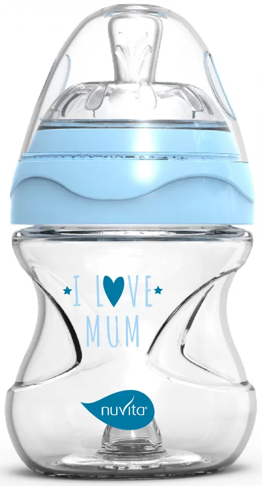 Skleněná lahvička Nuvita s ergonomickým tvarem a objemem 140 ml.