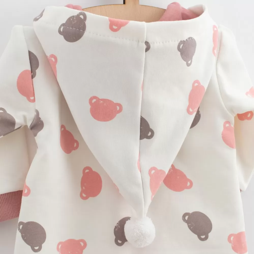 Roztomilý a praktický overal s kapucí české značky New Baby Little One. Overálek je celopotištěný medvídky, má zapínání na zip po celé délce a pružné lemy na rukávcích a nohavičkách. Kapuce je podšitá barevnou podšívkou a je zdobena roztomilou bambulkou. Overal je vyroben z pohodlné teplákoviny. Vhodný pro celoroční nošení. Materiál: 96% bavlna, 4% elastan.