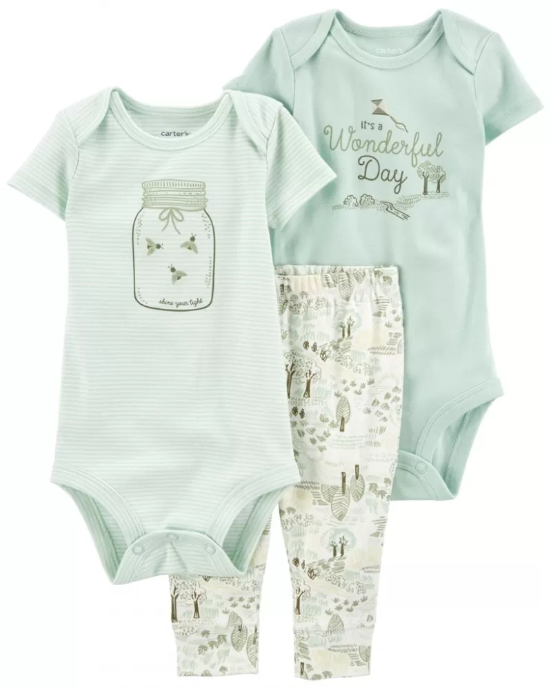Všechny modely značky Carter's jsou vyrobeny ze super měkké bavlny a spoustou lásky. Set 3.dílný je velmi vhodný i do výbavičky děťátka. Nemusíte přemýšlet nad kombinací. Jednoduše stačí jen obléct. Všechny výrobky jsou navrženy tak, aby byly velmi pohodlné pro nošení a v trendy barvách. Sety jsou velmi oblíbené u maminek. Vlastnosti: - 3 kusy v setu - oblékání děťátka je jednodušší - příjemně měkký materiál - komfortní pro nošení - vhodné pro teplé dny - dodáváno na ramínku Materiálové složení: 100% bavlna Údržba: Doporučujeme dodržovat prací symboly uvedené na etiketě výrobku. Pro praní doporučujeme použít prací prostředky značky Chicco. Najdete na našem eshopu.