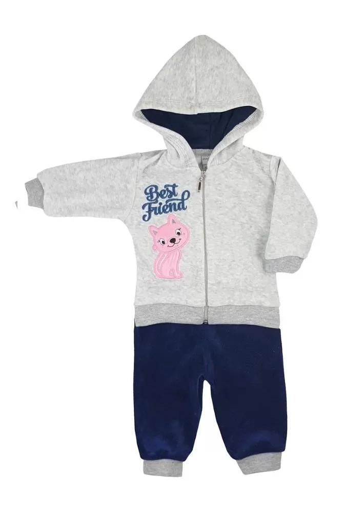 Dětská 2-dílná semišková soupravička Koala Best Friend. Součástí soupravičky jsou tepláčky a mikina. Mikinku zdobí krásný obrázek kočičky s nápisem Best Friend. Má zapínaní na zip po celé délce, pružný lem v pase, na rukávcích a praktickou kapuci. Tepláčky jsou jednobarevné. Díky pružnému lemu na nohavičkách a v pase prokáží dítěti dobrou službu. Je vyrobena z velmi příjemného a měkkého materiálu, ve kterém se bude vaše miminko cítit velmi pohodlně. Materiál: 80%bavlna, 20% polyester. Rozměry: mikina: obvod hrudníku cca 60 cm, délka cca 36 cm, délka rukávu cca 29 cm, tepláčky: obvod pasu cca 42 cm, obvod boků cca 58 cm, délka cca 47 cm, délka od rozkroku cca 29 cm.