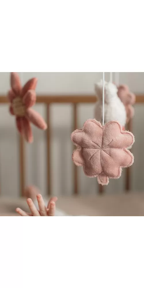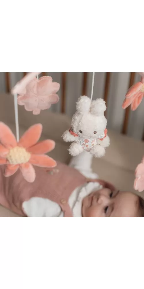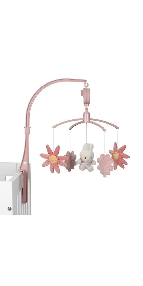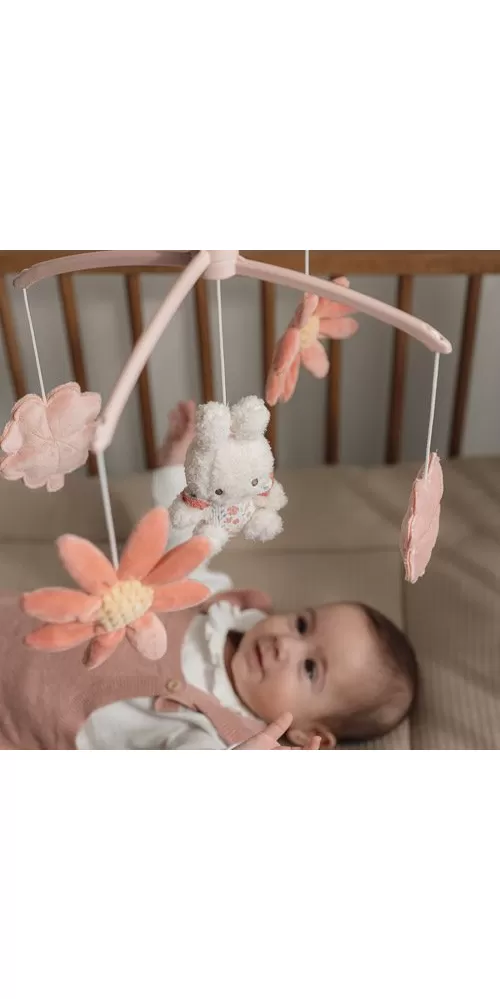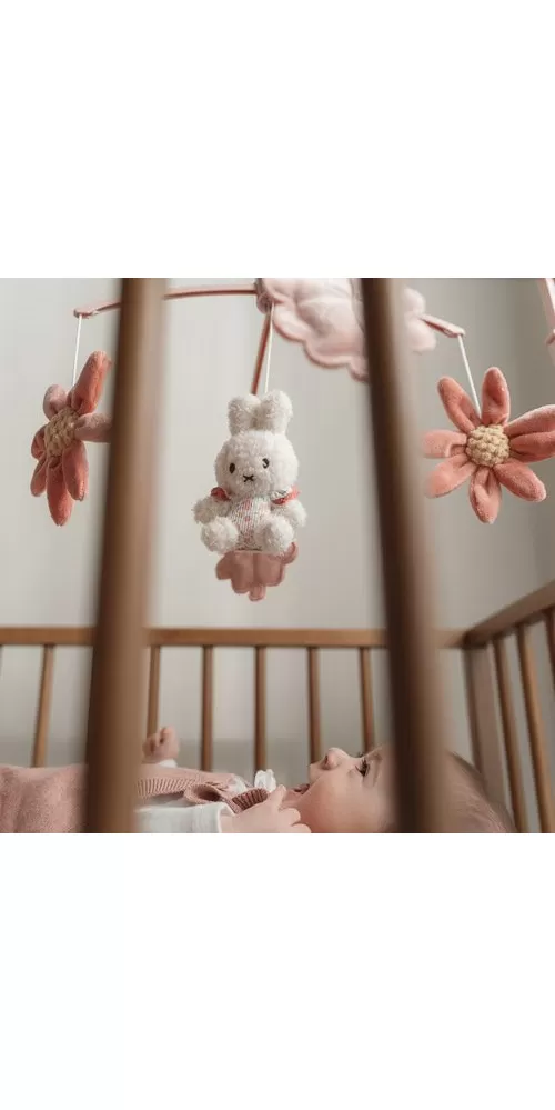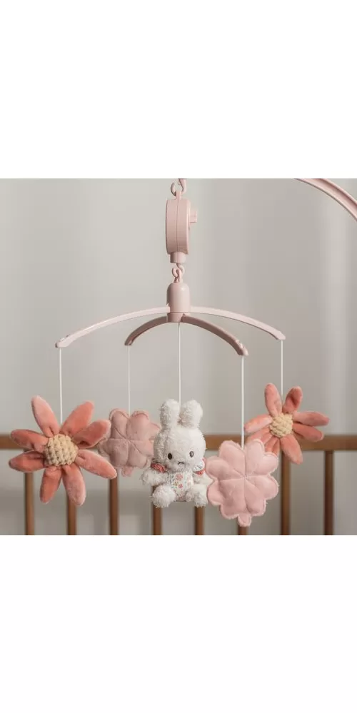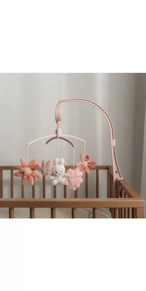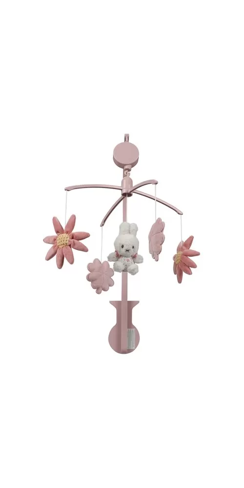 Kolotoč s natahovacím hudebním boxem hraje něžnou ukolébavku pro klidné usínání. Pozornost dítěte upoutají otáčející se plyšové hračky v podobě králíčka Miffy a kytiček v pastelových barvách. Kolotoč snadno připevníte na bočnici postýlky.
