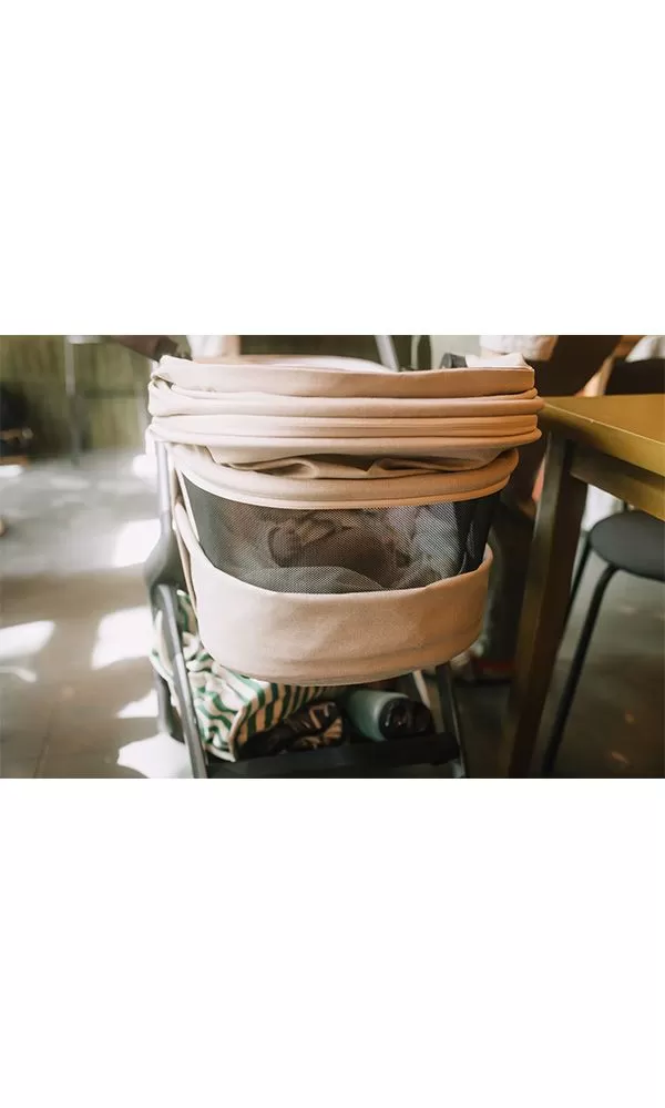 Pro ochranu před rušným okolním světem a různými povětrnostními podmínkami vás ochrání sluneční stříška. Tkaniny poskytují ochranu 50+ UPF a jsou vodoodpudivé. Rozšiřitelná část stříšky nabízí ještě více stínu a ochrany, a lze ji sklopit z 90 až na 140 stupňů.