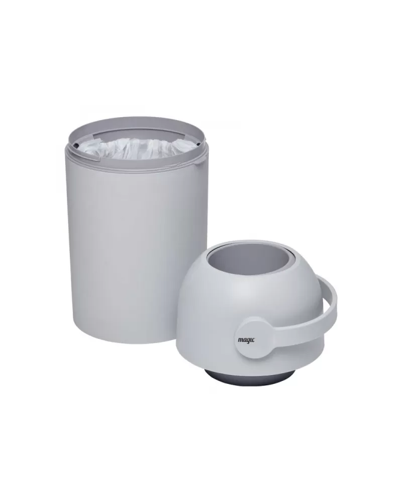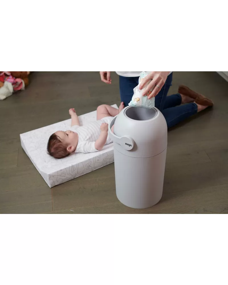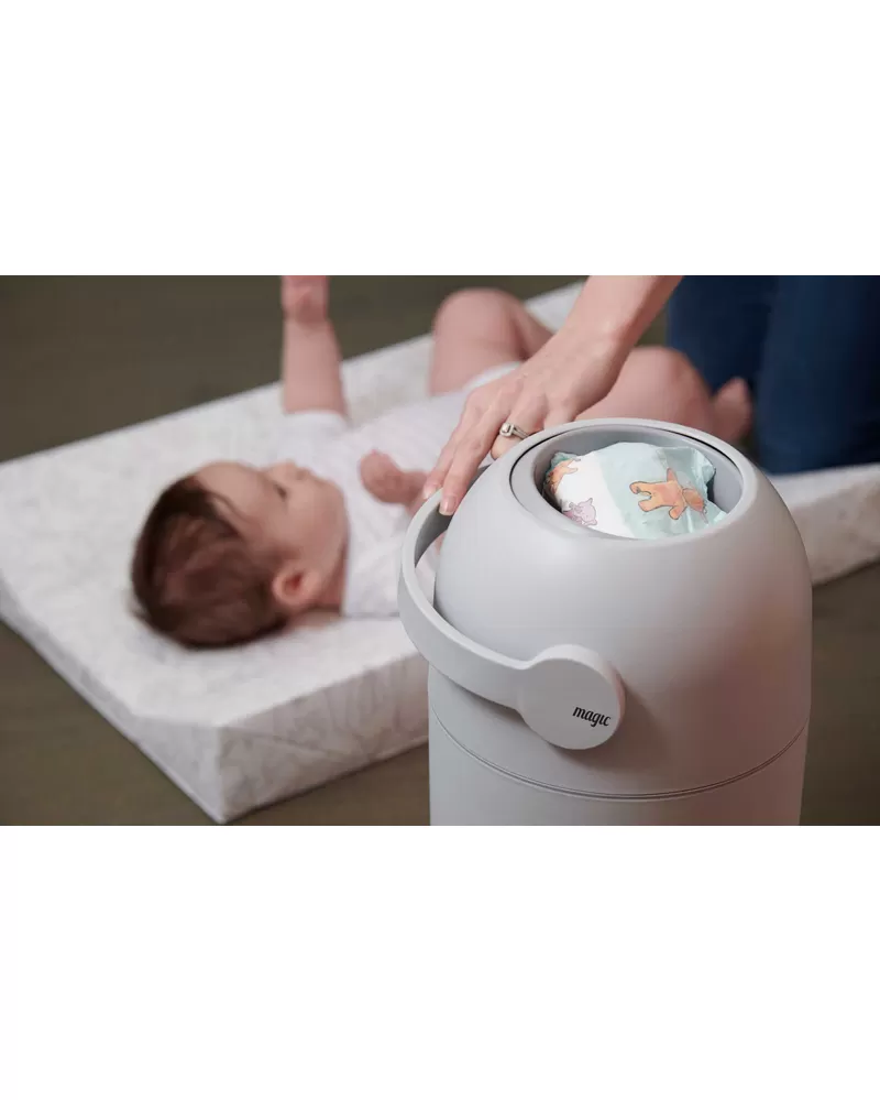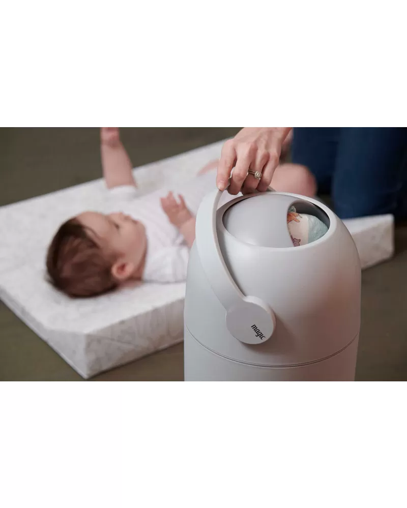 Patentovaný koš na pleny Magic poskytuje ochranu před nepříjemnými pachy a bakteriemi v dětském pokoji nebo kdekoli ve vašem interiéru. Použitou plenu snadno vložíte do koše bez jakéhokoli kontaktu s plenkami, které již v koši jsou. Otočením držadla plena propadne do koše a jeho otočením zpátky je koš opět připraven pro další použití. To vše jednou rukou, takže druhou můžete držet vaše miminko. Speciální systém těsnění udržuje zápach uvnitř koše.