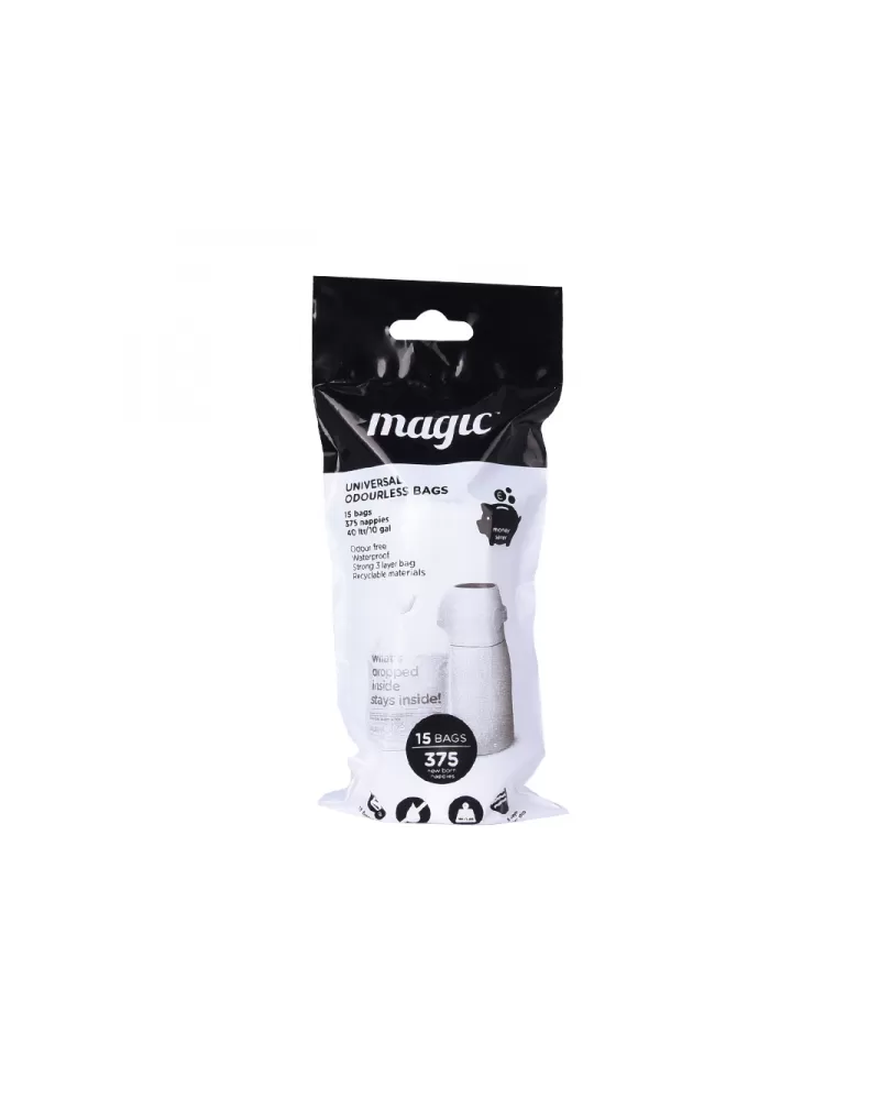 Použití koše je velmi ekonomické, protože nevyžaduje nákup speciálních náplní. Koš je určen pro použití s běžnými sáčky na odpadky. Pro maximální ochranu před zápachem doporučujeme použití originálních sáčků navržených do košů na pleny Magic. Tyto sáčky jsou vyrobeny z extra silného, 3-vrstvého materiálu, který brání protékání. Samostatně prodávané balení obsahuje 45 ks sáčků (3 role / 15ks) z recyklovaného materiálu.